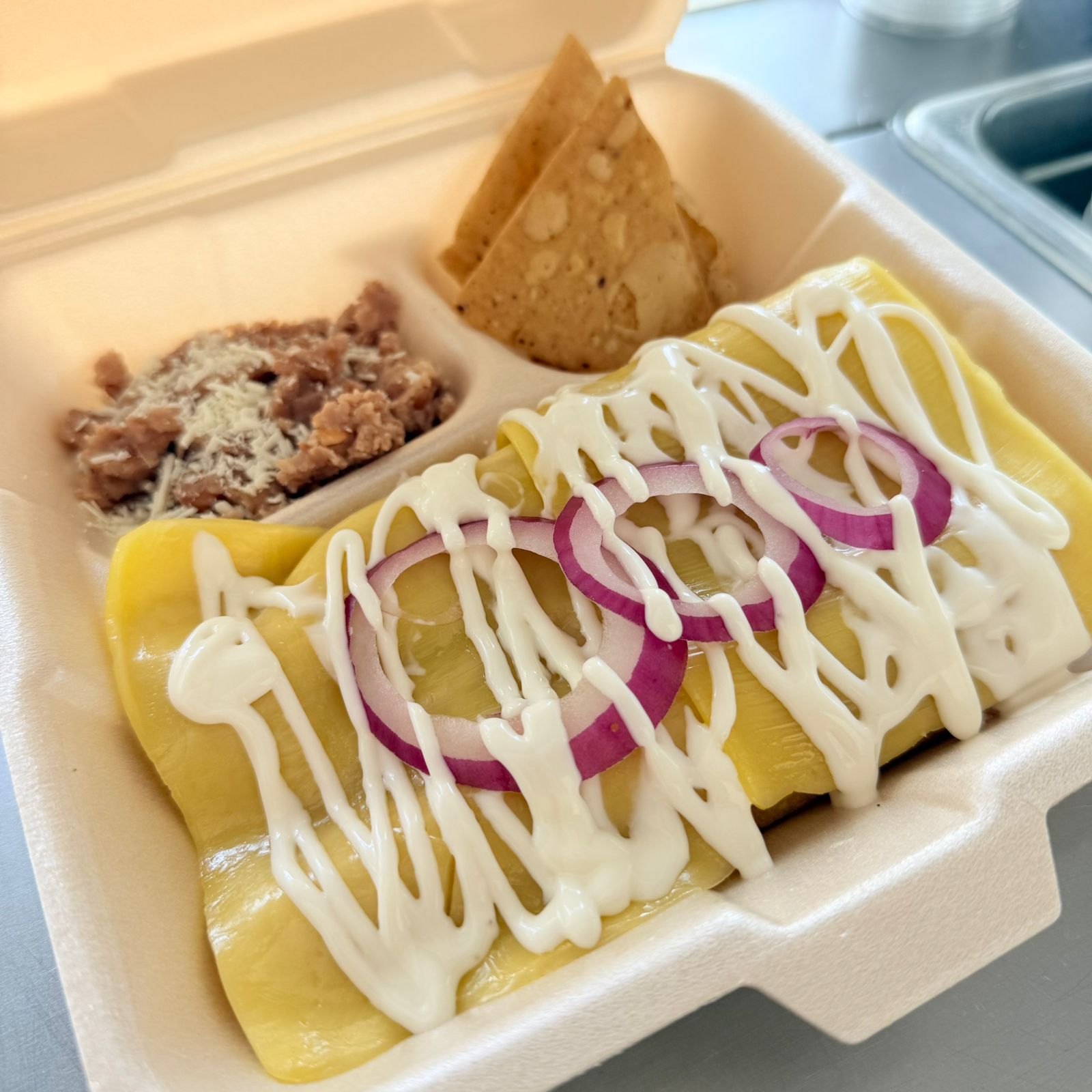 4 pzas, bañadas en salsa de frijol con crema, queso y cebolla.