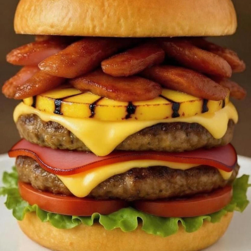 Pan brioche, doble porción de carne, doble queso amarillo, jamón, salchicha, lechuga, jitomate y piña