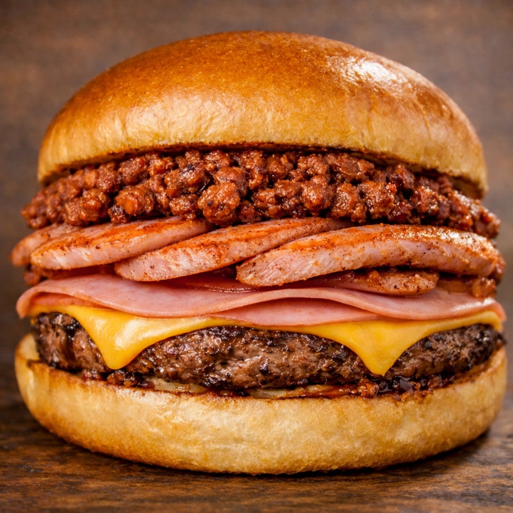 Pan Brioche, cheddar, manchego y Oaxaca, carne, jamón y salchicha