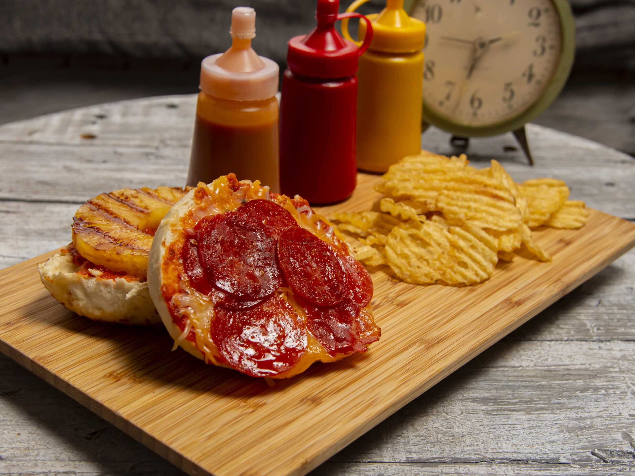 Peperoni, queso manchego, queso mozarella, piña asada y salsa de tomate. *todos los bagels van acompañados de chips de papa*