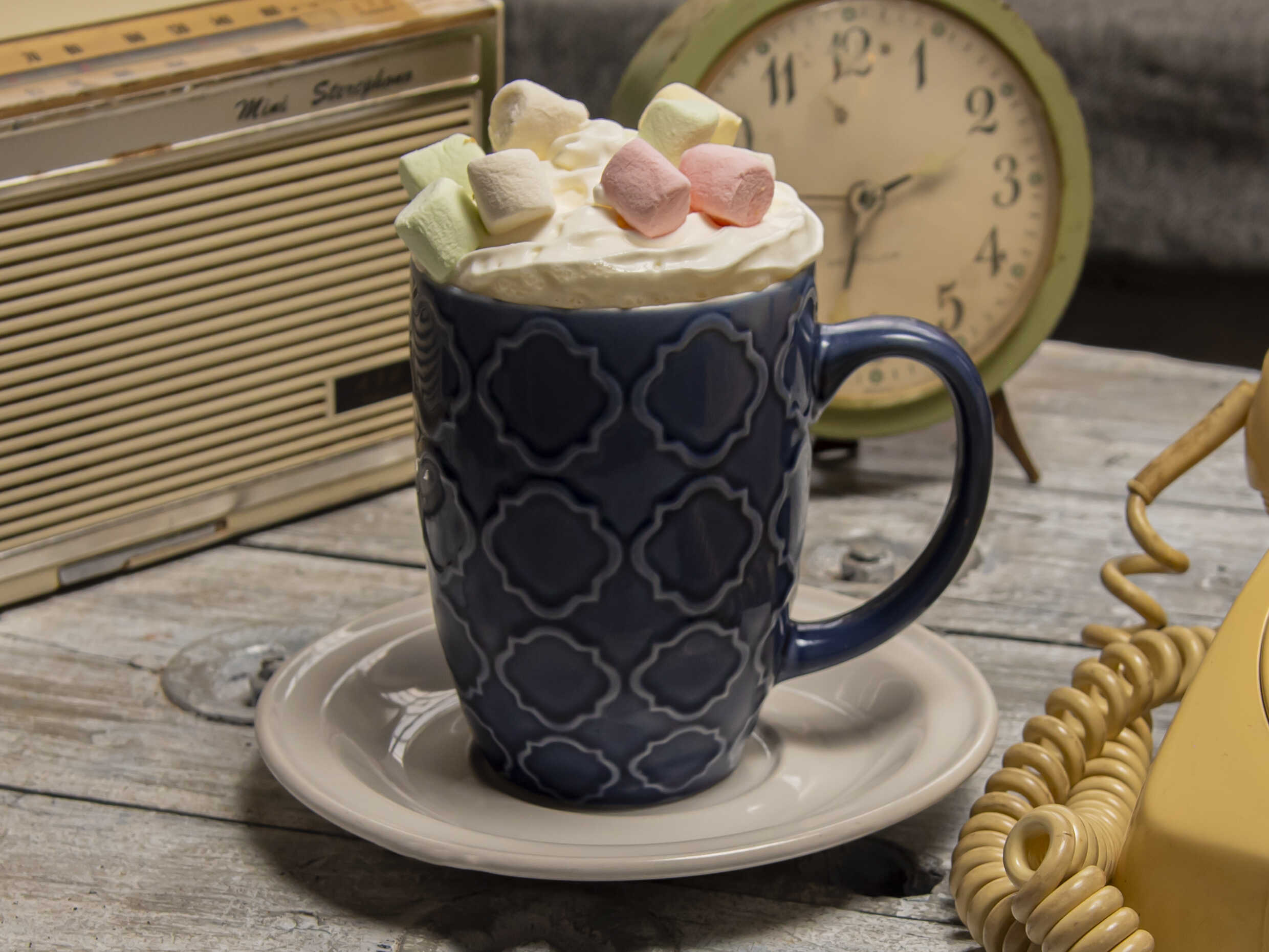 Chocolate blanco con menta, crema batida y bombones.