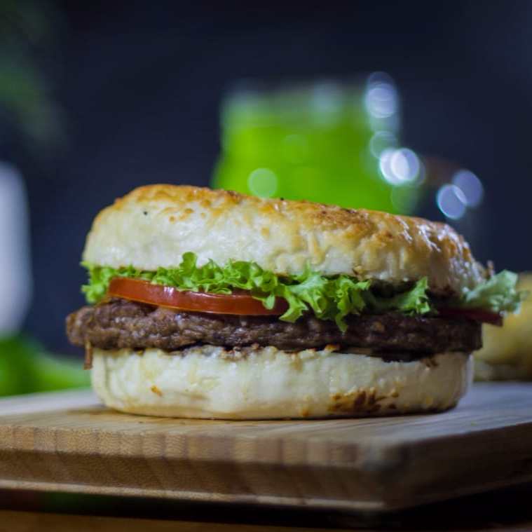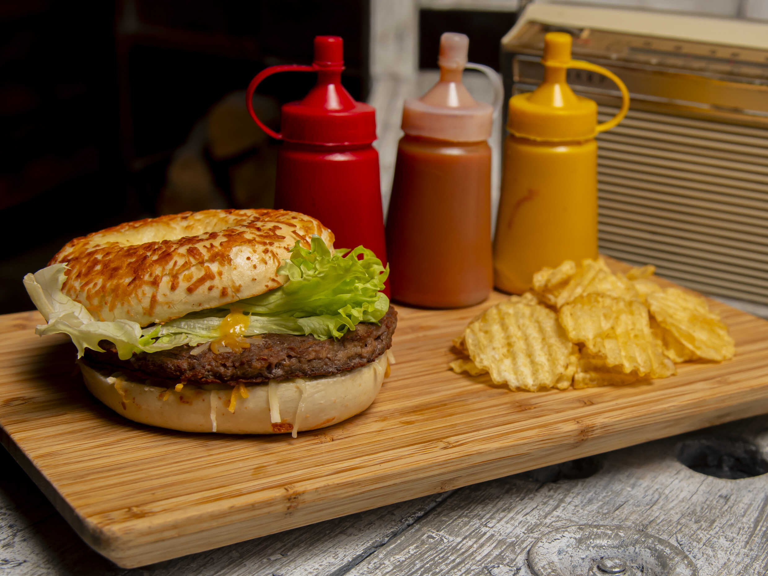 Hamburguesa de arrachera, queso manchego, queso mozarella, jitomate y lechuga. *todos los bagels van acompañados de chips de papa*