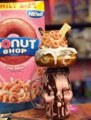 Malteada sabor vainilla, dona, cereal lucky charms, crema batida y chispas.