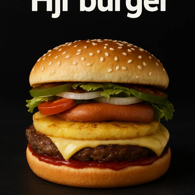 Carne de 110 g, queso manchego fundido, piña a la plancha y salchicha, acompañada de catsup, más lechuga fresca, cebolla, jalapeño y jitomate. Un toque tropical con el sello de la jr.