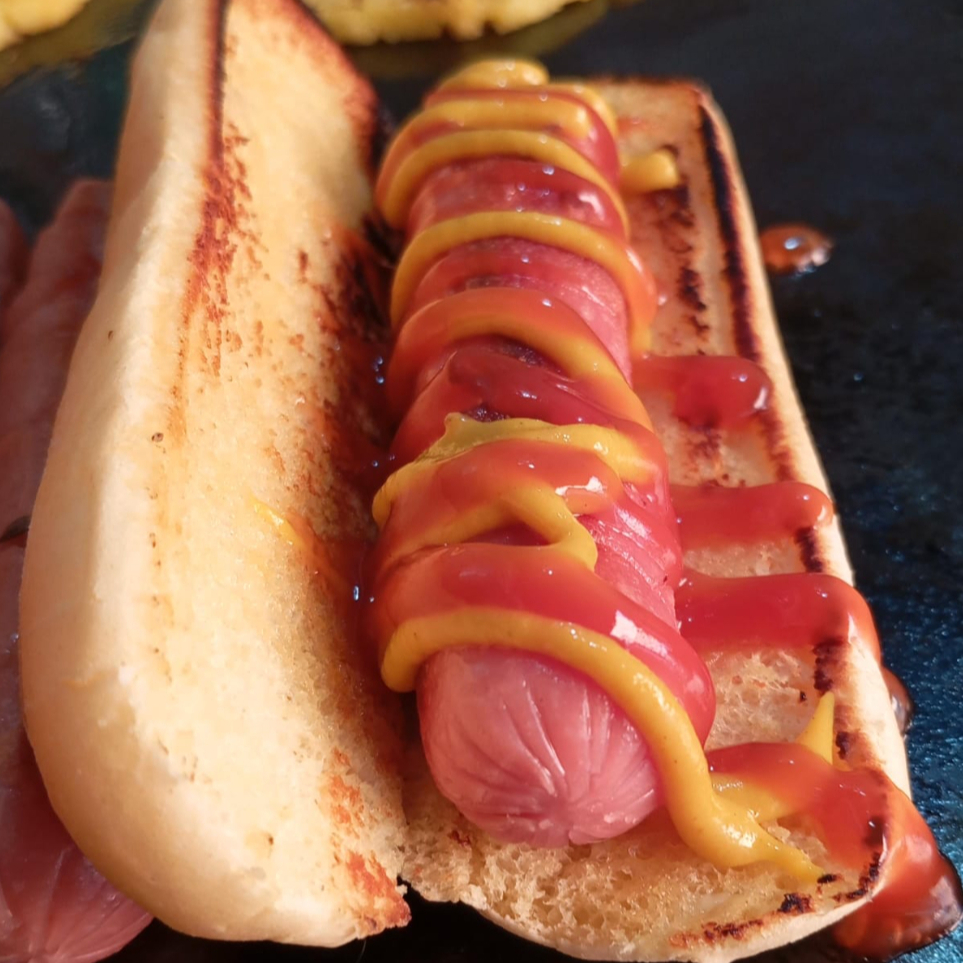 Pan dorado con salchicha, mayonesa, mostaza miel y cátsup.