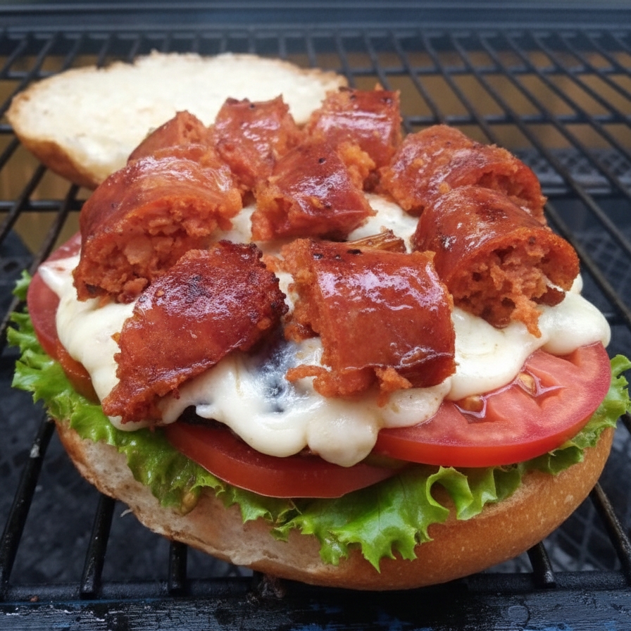 Carne de res con chorizo ranchero, queso Oaxaca, chorizo tradicional, mayonesa y kétchup. ¡Llena de sabor y con un toque auténtico! 🍔🧀🌶️