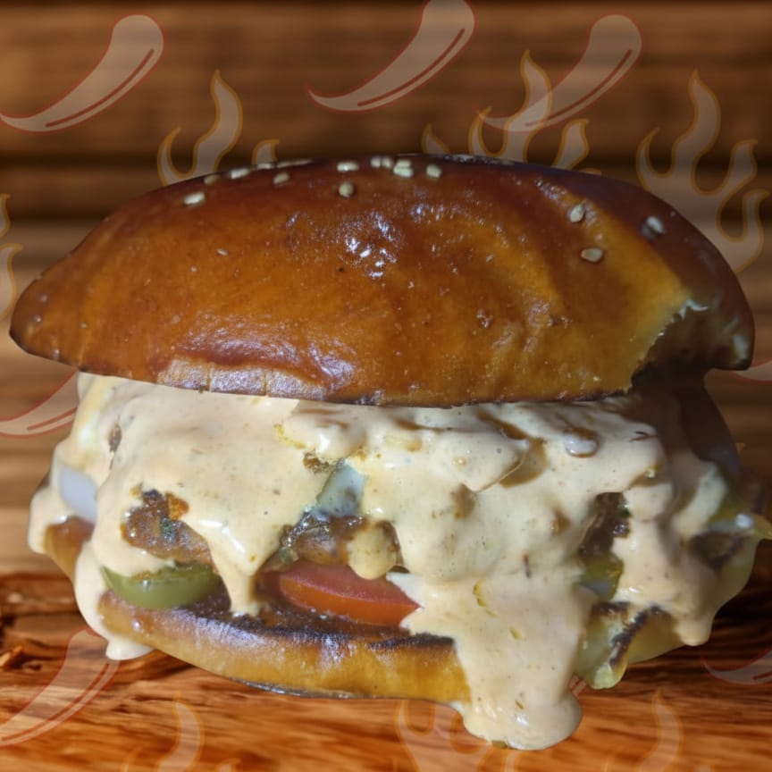 "P" Burger está hecha para los amantes del sabor intenso: una jugosa carne de 130g sazonada con un mix especial de chiles que le da el nivel perfecto de picor. Acompañada de mayonesa con chipotle, queso Oaxaca derretido, cebolla caramelizada, jalapeños en vinagre y jitomate fresco.