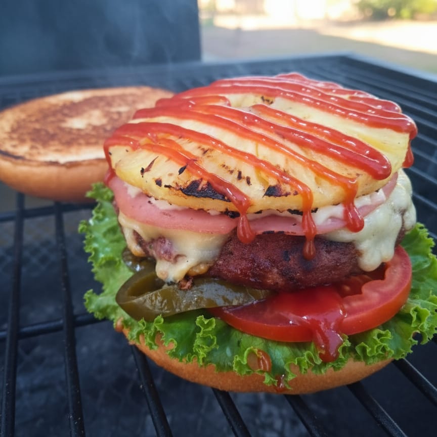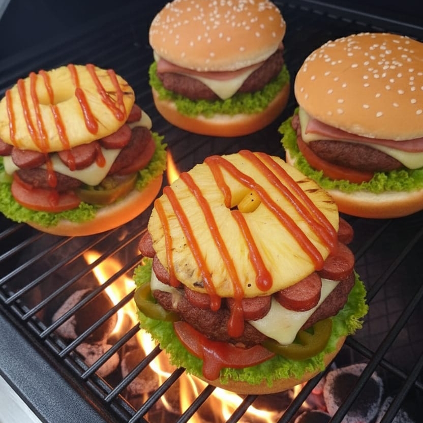 Carne de res, salchicha, piña, queso manchego, mayonesa y kétchup. ¡Un sabor único que sorprende! 🍔🌭🧀🍍