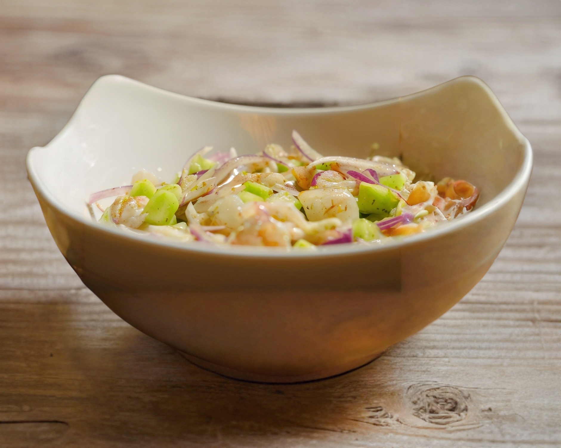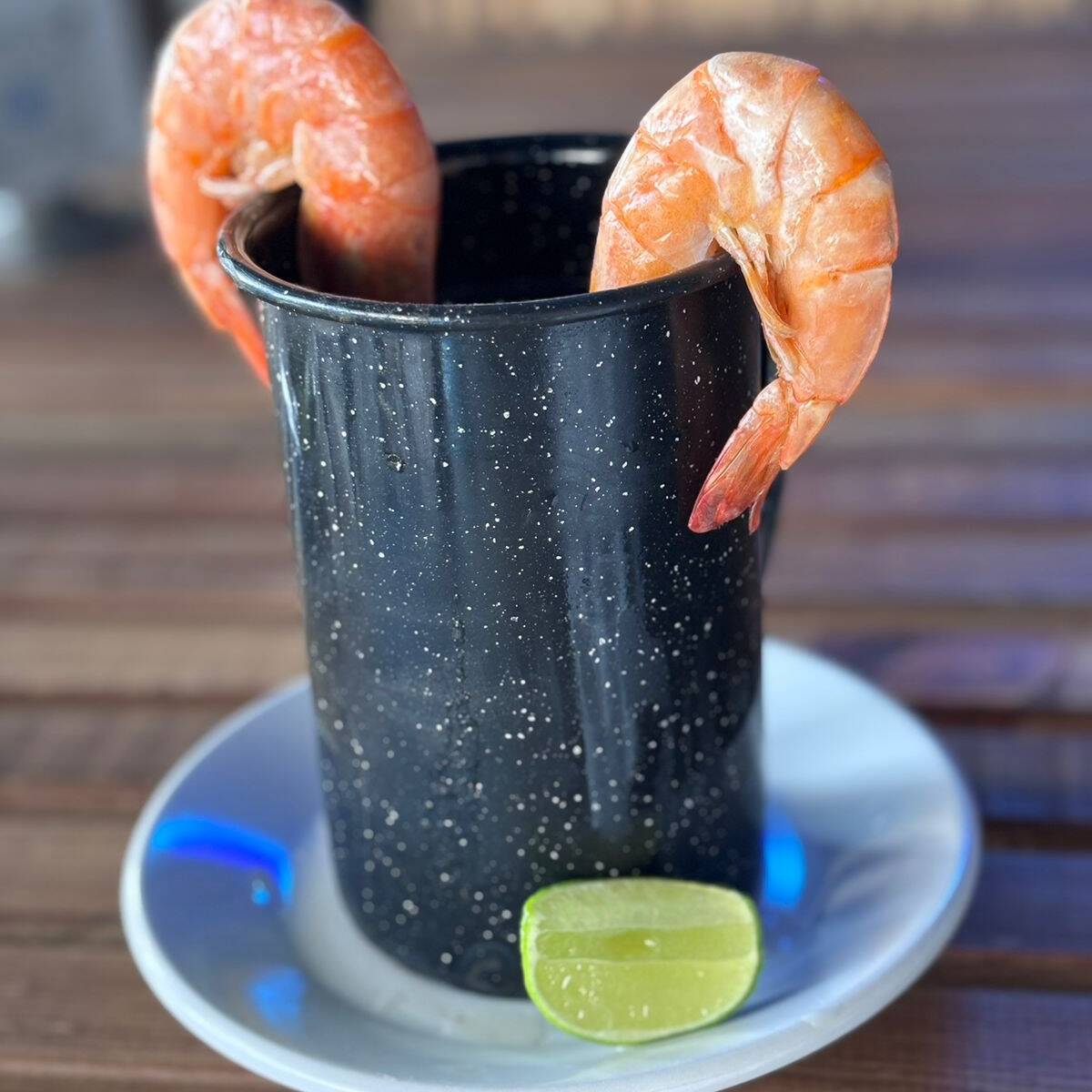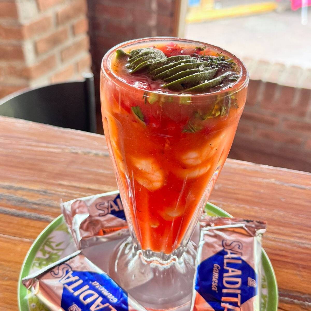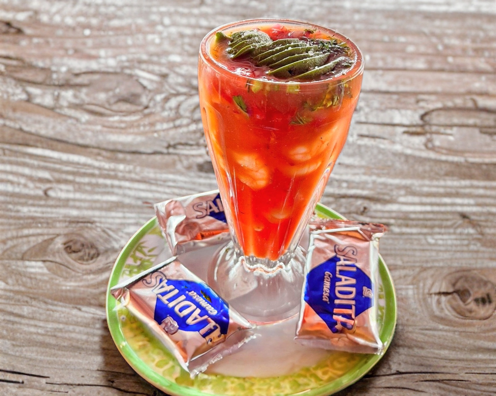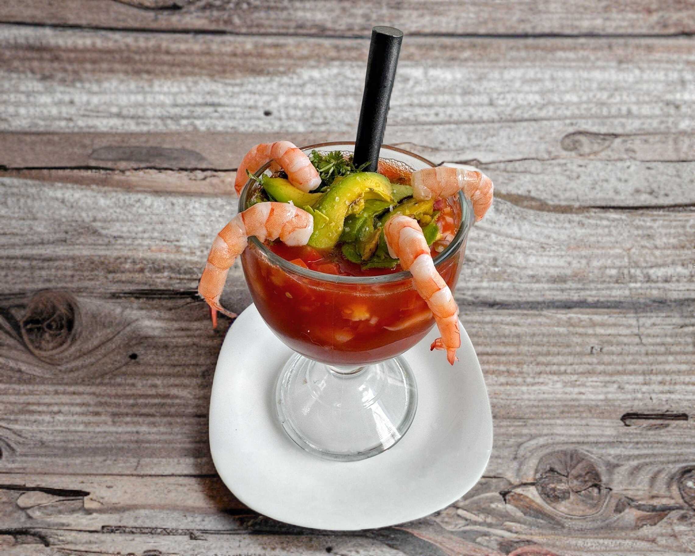 Camarón cocido, salsa coctelera, cebolla morada, jitomate y pepino, aguacate.