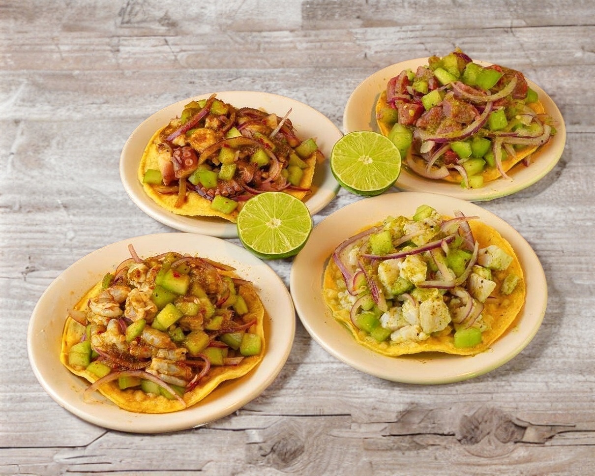 Camarón crudo y pulpo, curtido con limón y especies, salsa de su agrado, cebolla morada y pepino en julianas.