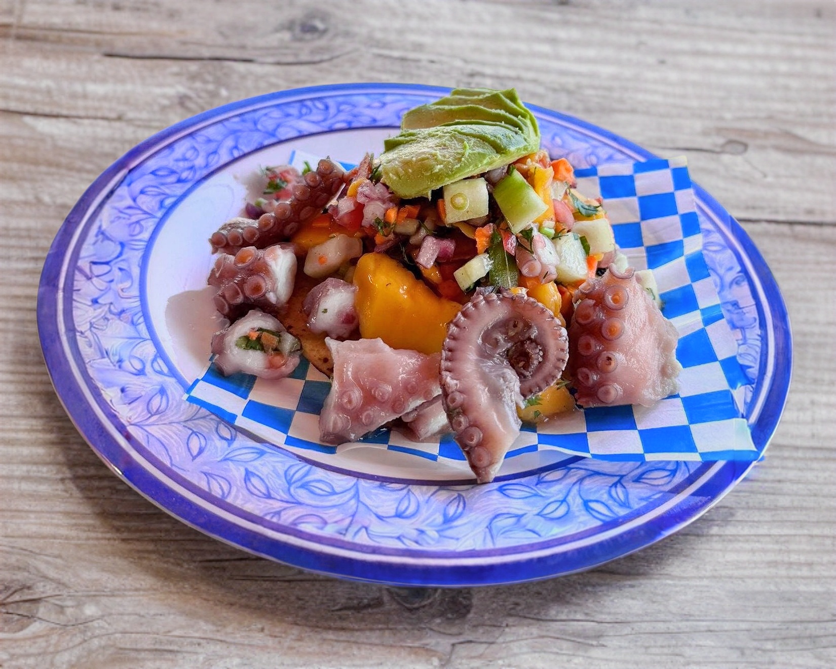 Camarón crudo y pulpo, curtido con limón, y especies, jitomate, cebolla morada, pepino, zanahoria, mango
