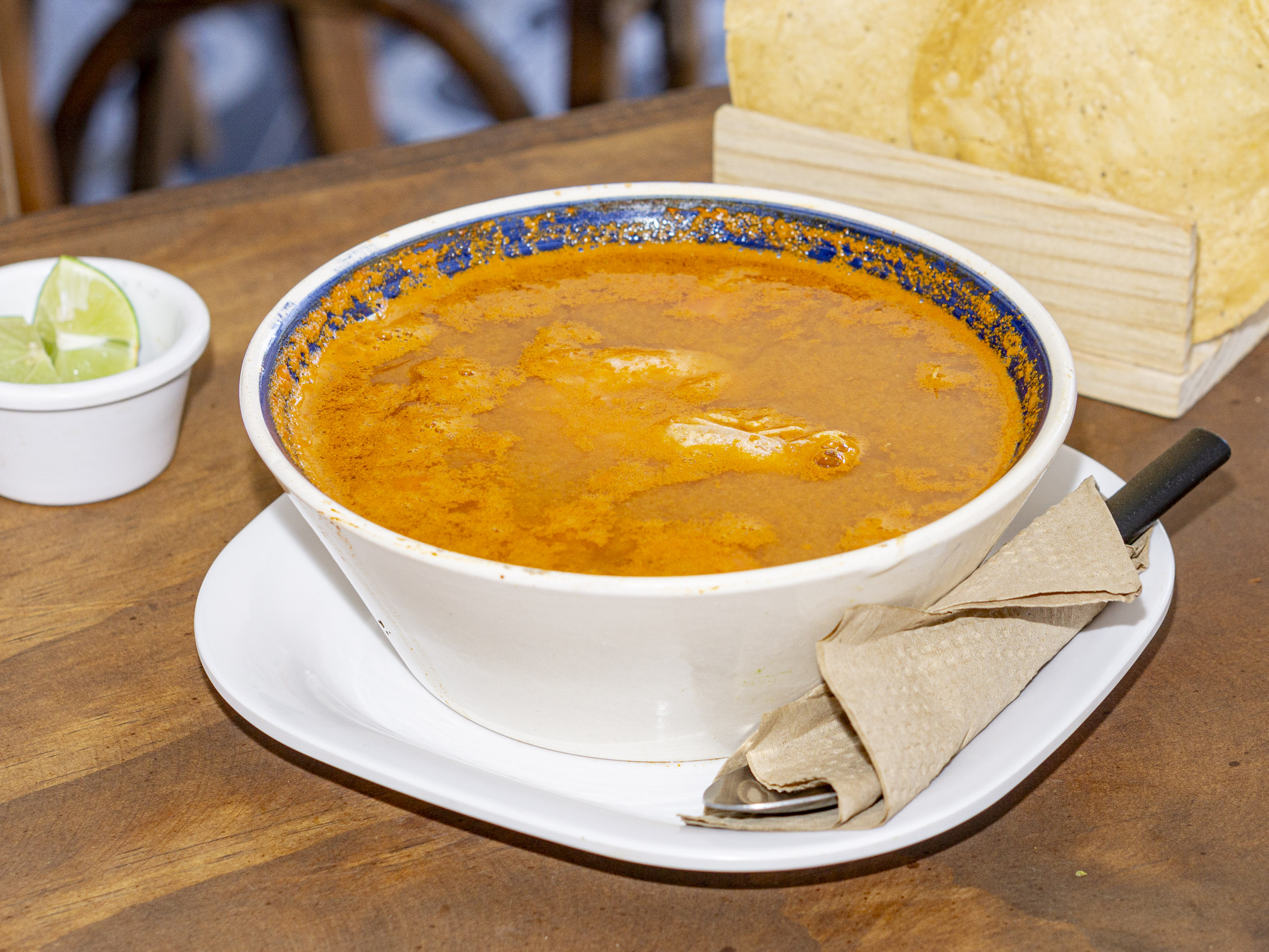 Pescado tilapia, capeado, en tortilla de maíz, col, pepino, cebolla morada, aguacate y aderezo de chile de árbol