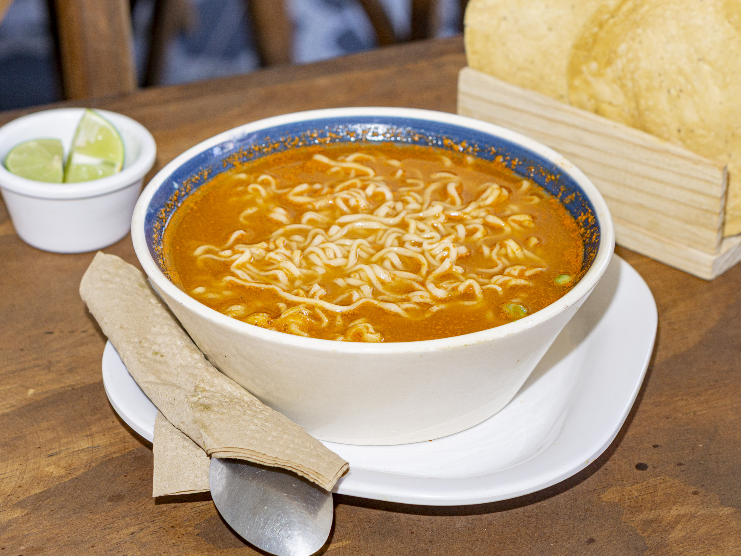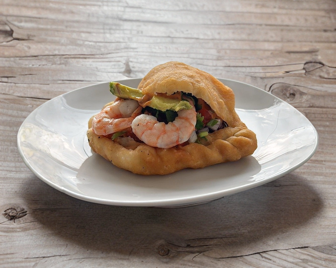 Masa para empanadas, rellena de camarón cocido y pulpo, jitomate, cebolla, aguacate y aderezo picosito.