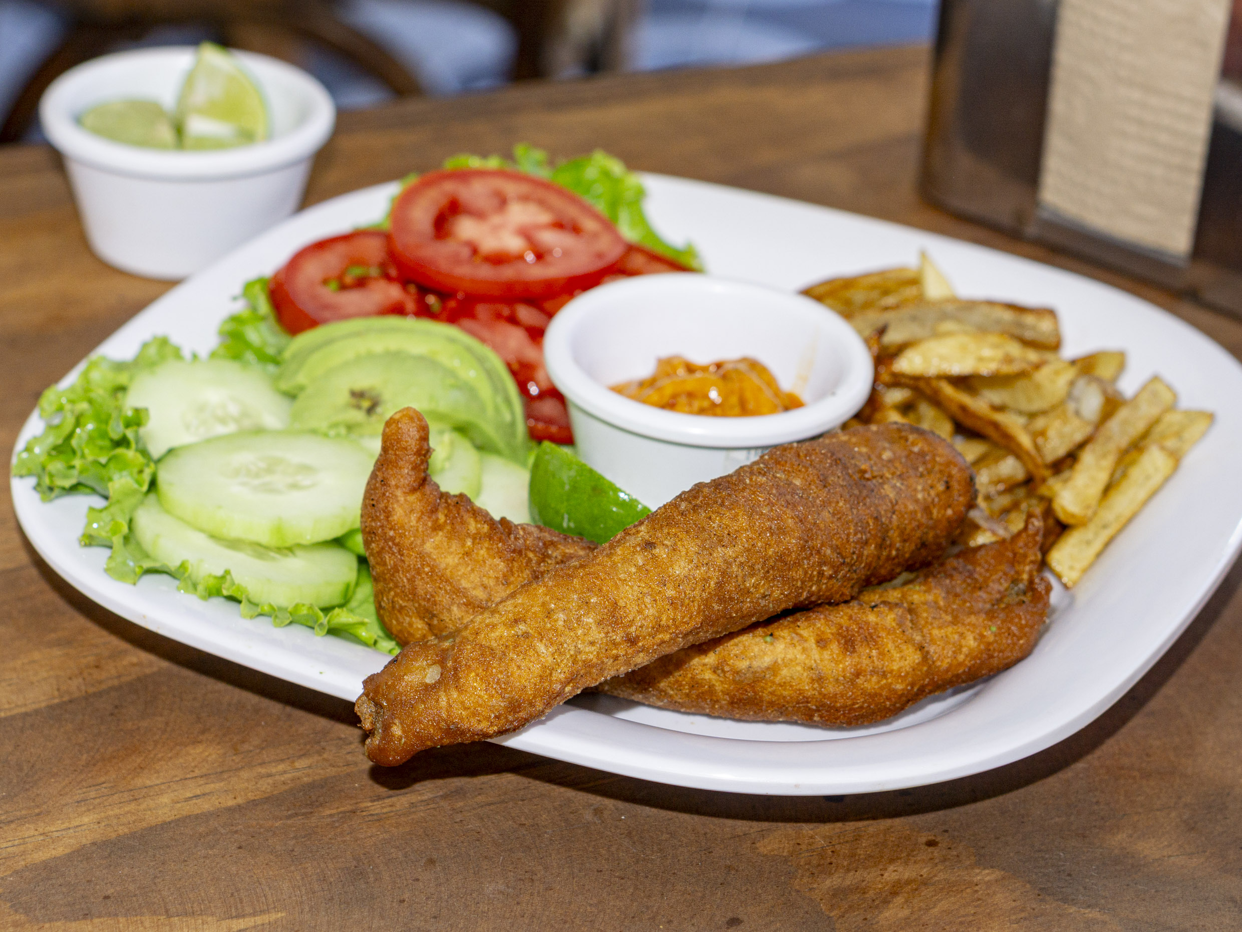 Filete de pescado empanizado acompañado de ensalada de verduras y papas a la francesa.