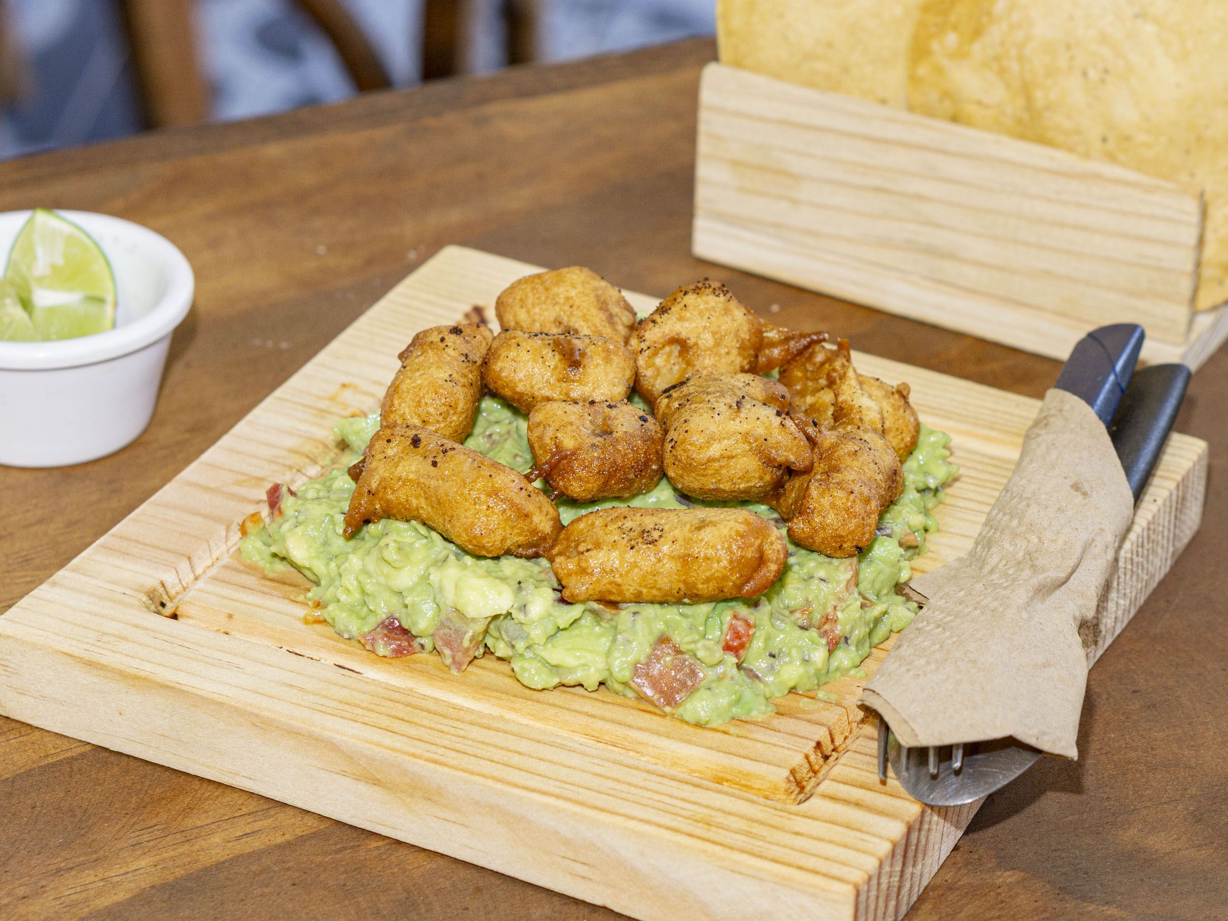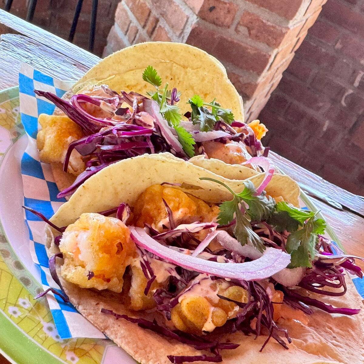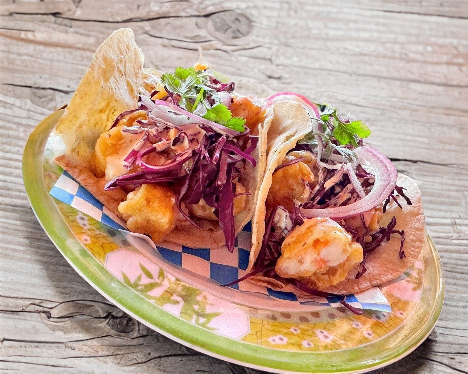 Camarón capeado, en tortilla de maíz, col, pepino, cebolla morada, aguacate y aderezo de chile de árbol.