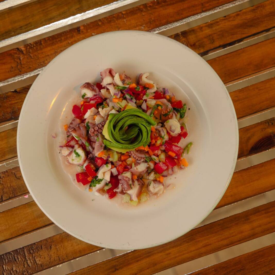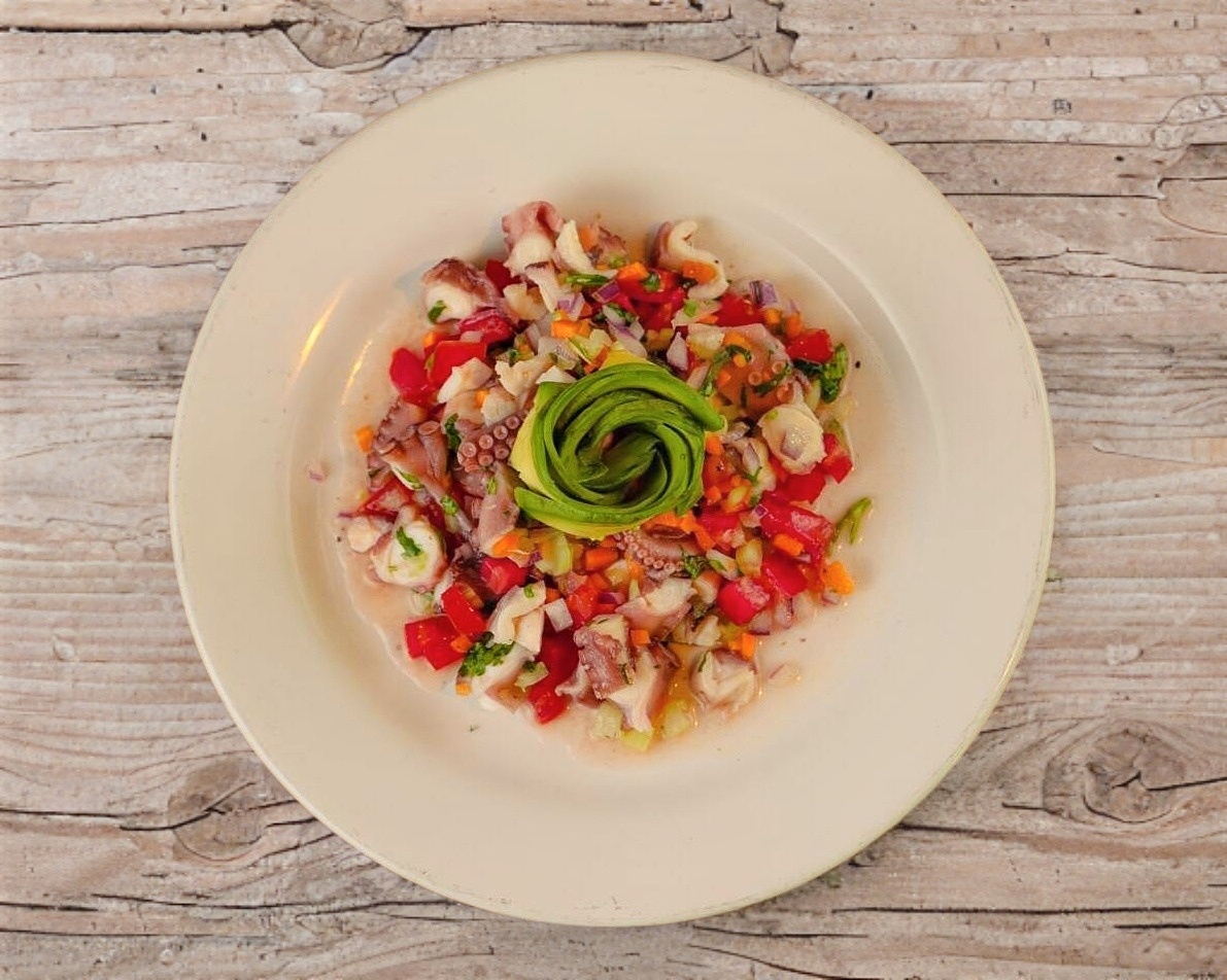 Pulpo, salsa coctelera, cebolla morada, jitomate y pepino, aguacate.
