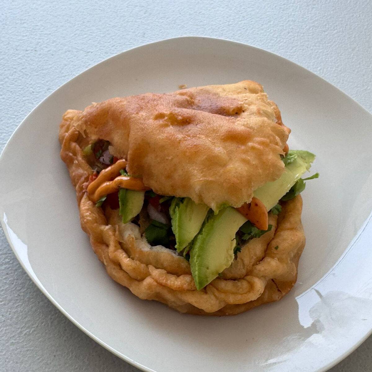 Masa para empanadas, rellena de atún guisado, jitomate, cebolla, aguacate y aderezo picosito.