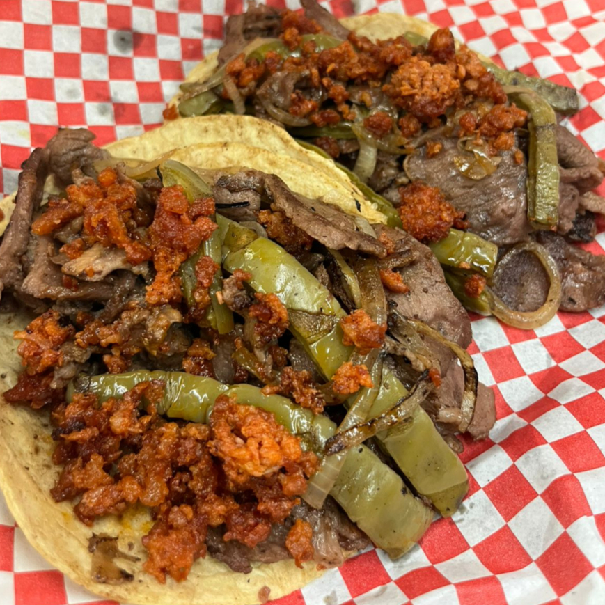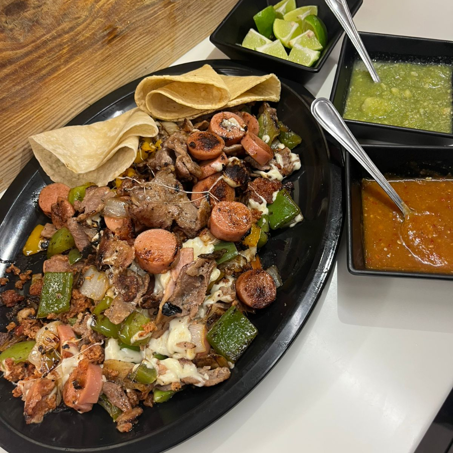 Para compartir (2 personas aprox) Bistec, Salchicha, Tocino, Chile Morron, Cebolla, Quesillo. ACOMPAÑADOS DE GUACAMOLE CON HABANERO Y 10 TORTILLAS (4 DE HARINA Y 6 DE MAIZ)