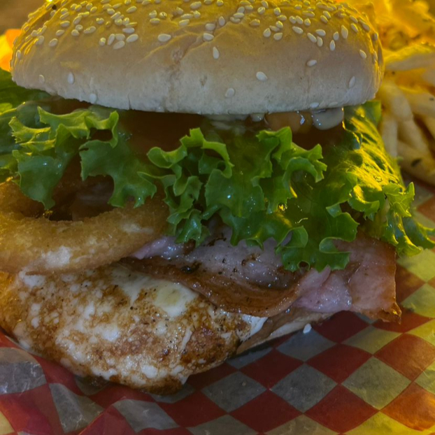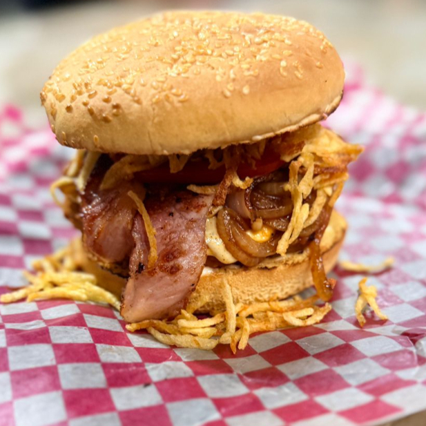 Doble carne res, Carne de pollo, Queso americano, Tocino, Aros de cebolla, Verduras y Aderezos.