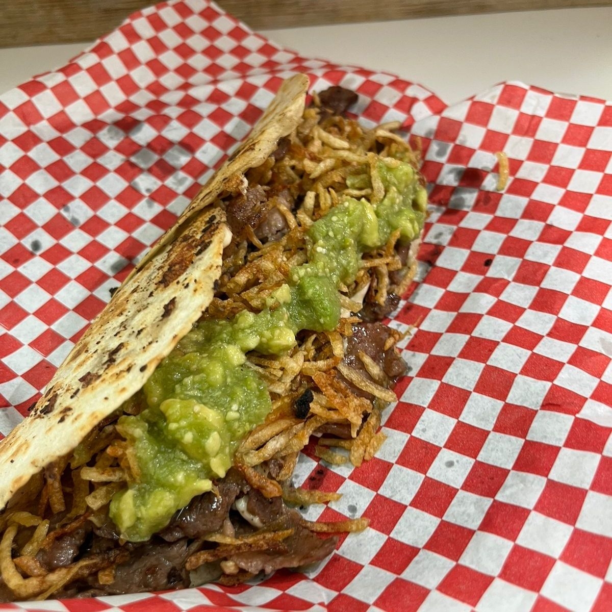 Doble tortilla de harina, Bistec, Quesillo, Guacamole con habanero y Crunch de papa.