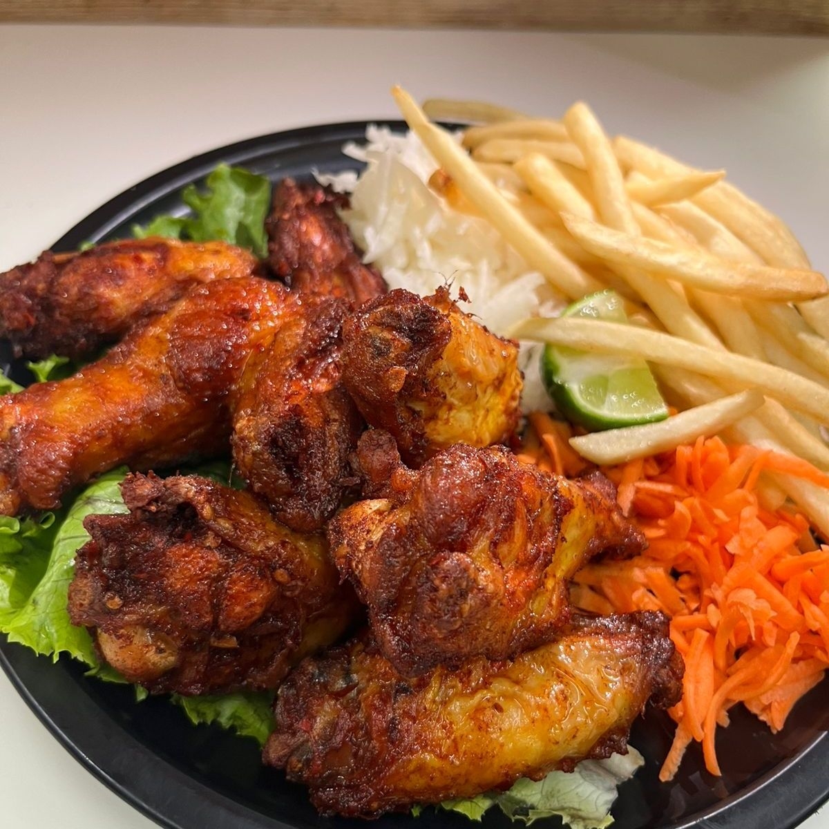 500gr de alitas aderezadas acompañadas de verduras(zanahoria y jicama), de papas fritas,de bbq, ranch y bufalo