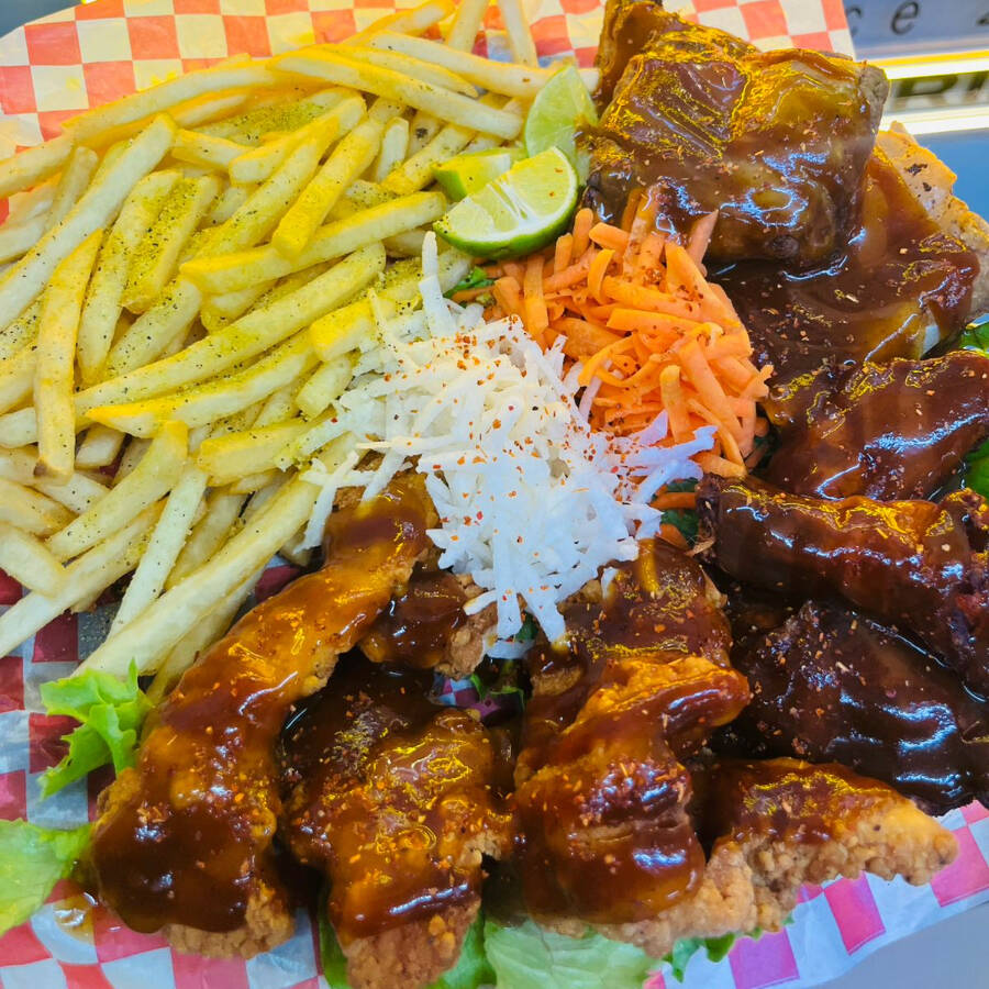 Alitas, fajitas de pollo y costillas aderezadas, acompañadas de papas y verduras