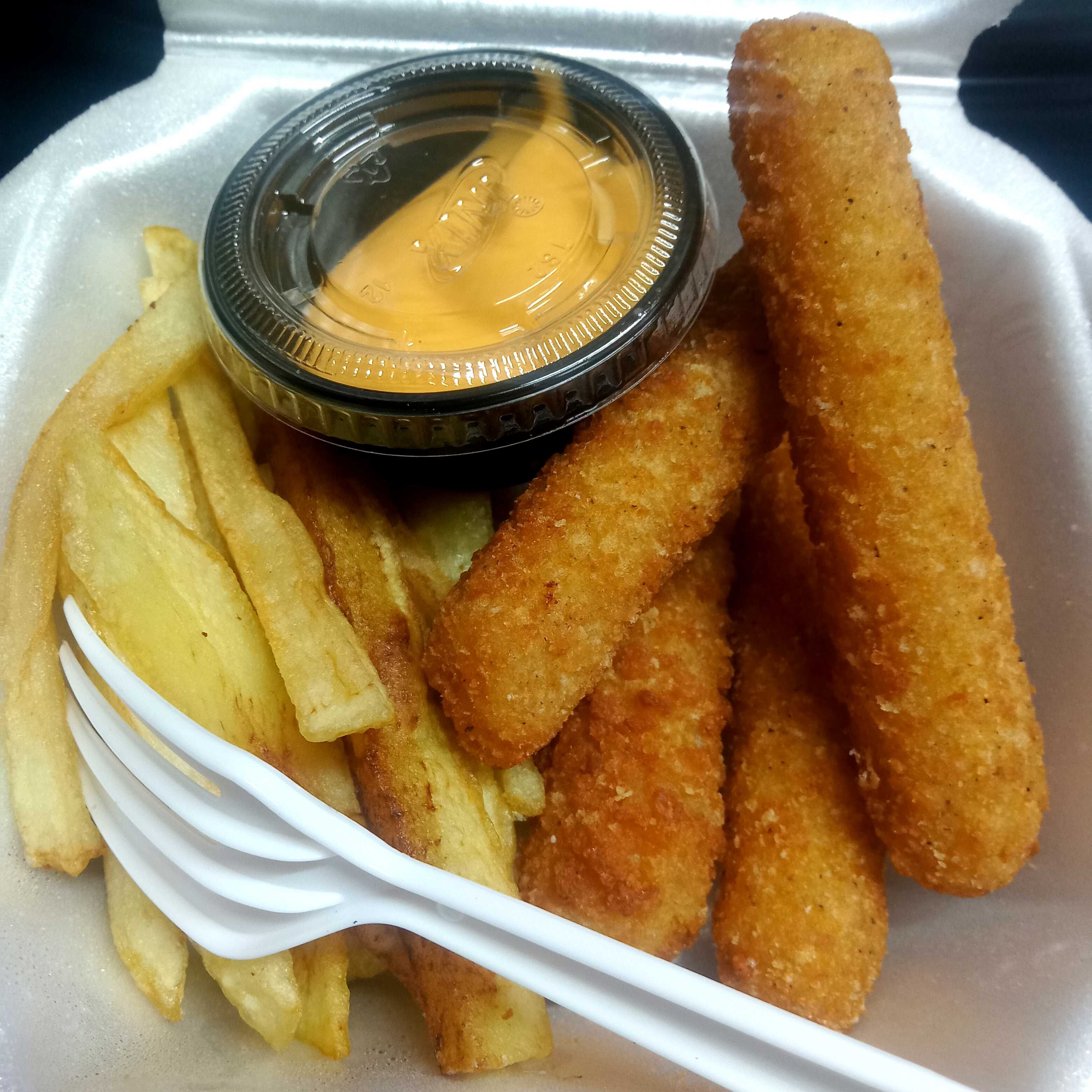 2 piezas de banderillas de Salchicha con queso Gouda y 150 gr de papa a la francesa