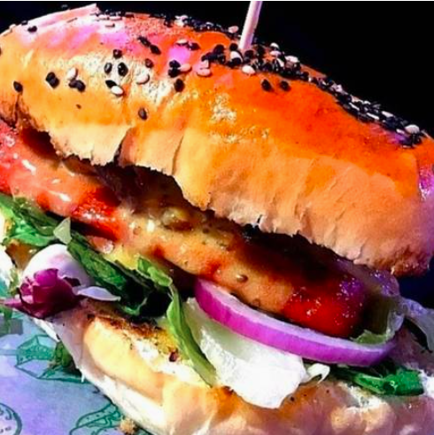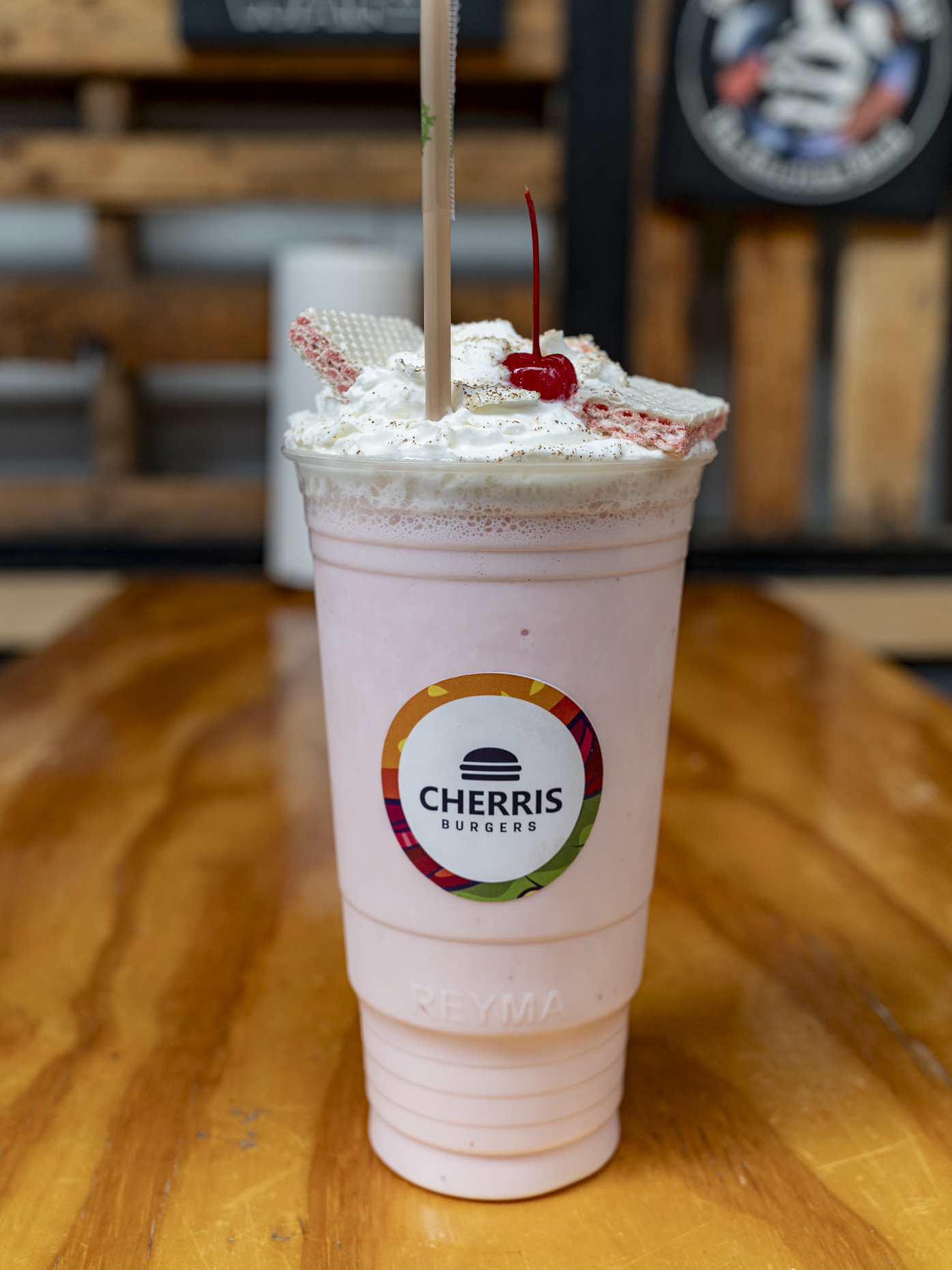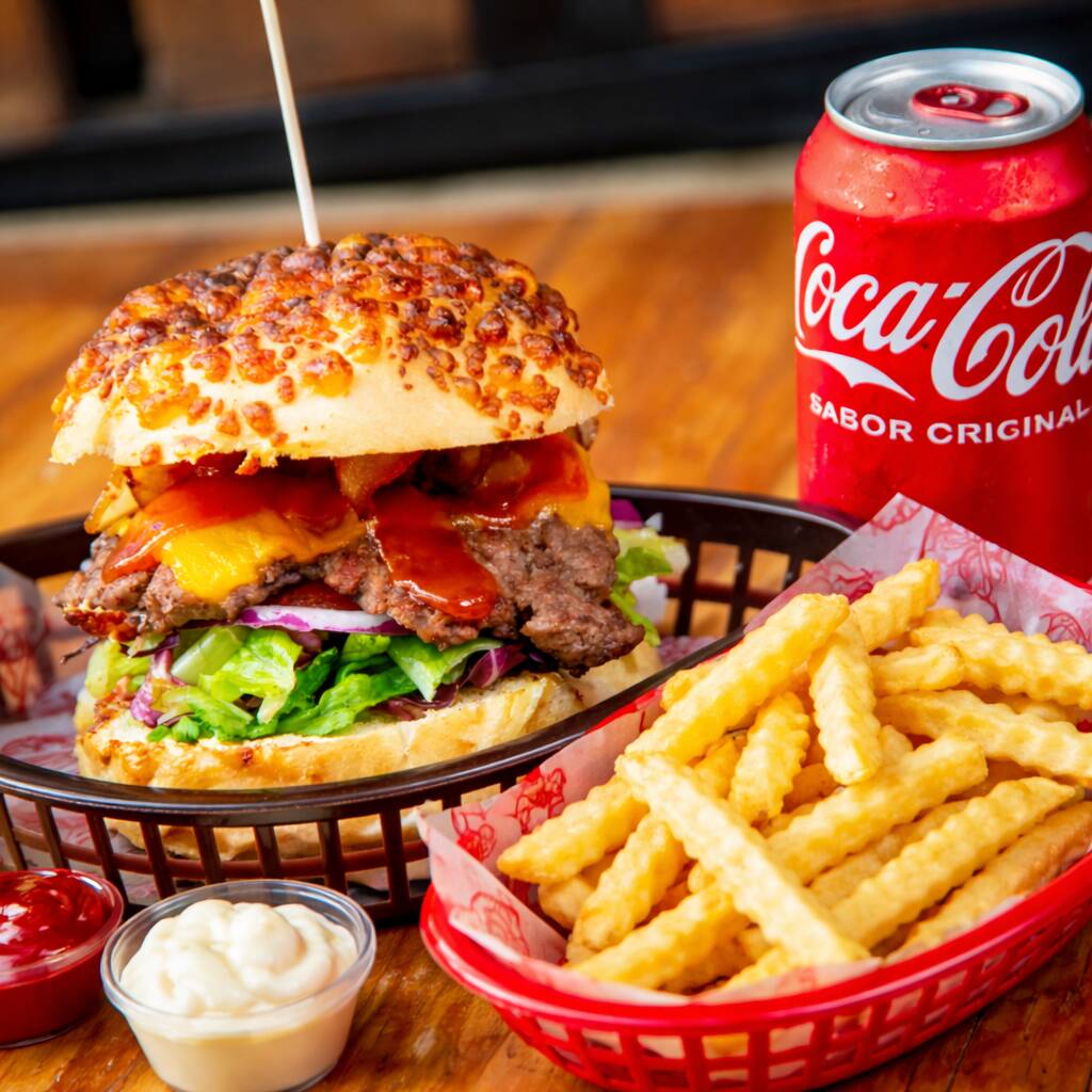 Delas consentidas en cherrias burgers, carne gratinada con queso monterrey, tocino, ensalada y aderezo ranch o habanero.