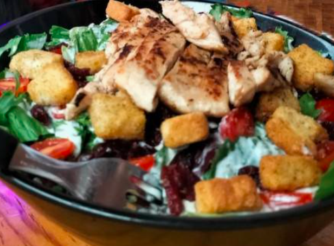 Mezcla de lechuga italiana con arrúgula, jitomate, cebolla, arándano, aceitunas negras, pollo adobado, tocino frito.