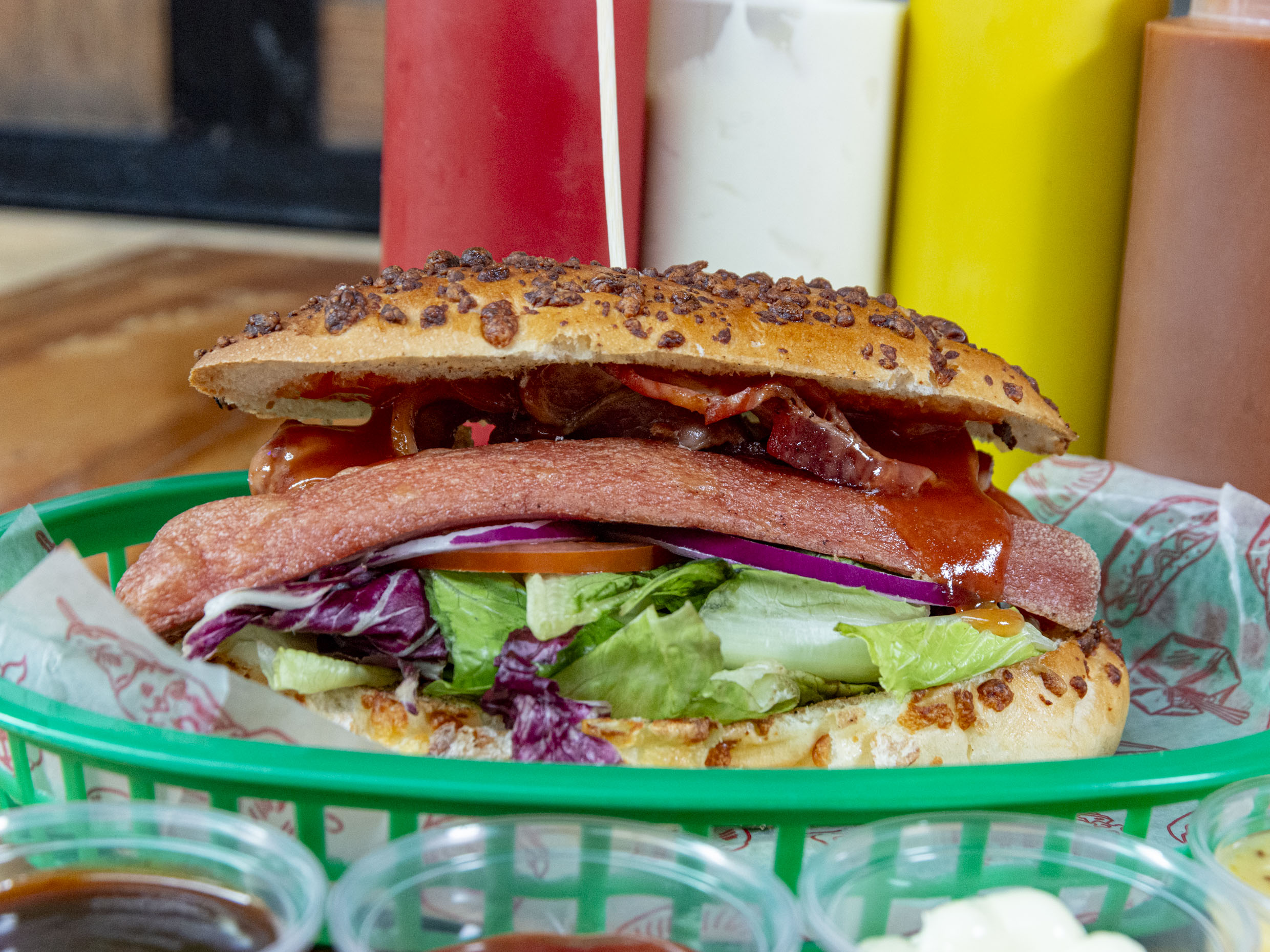Salchicha de res frita con aderezo cremoso de chipotle, lechuga, jitomate asado, pepinillos dulces y aros de cebolla.