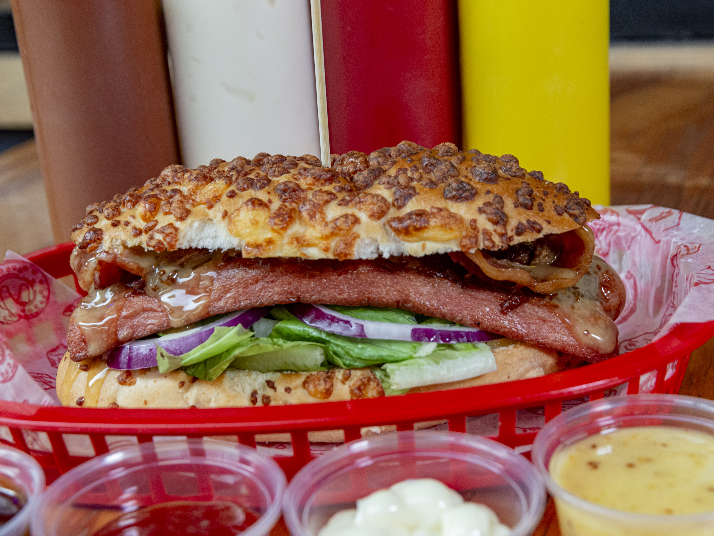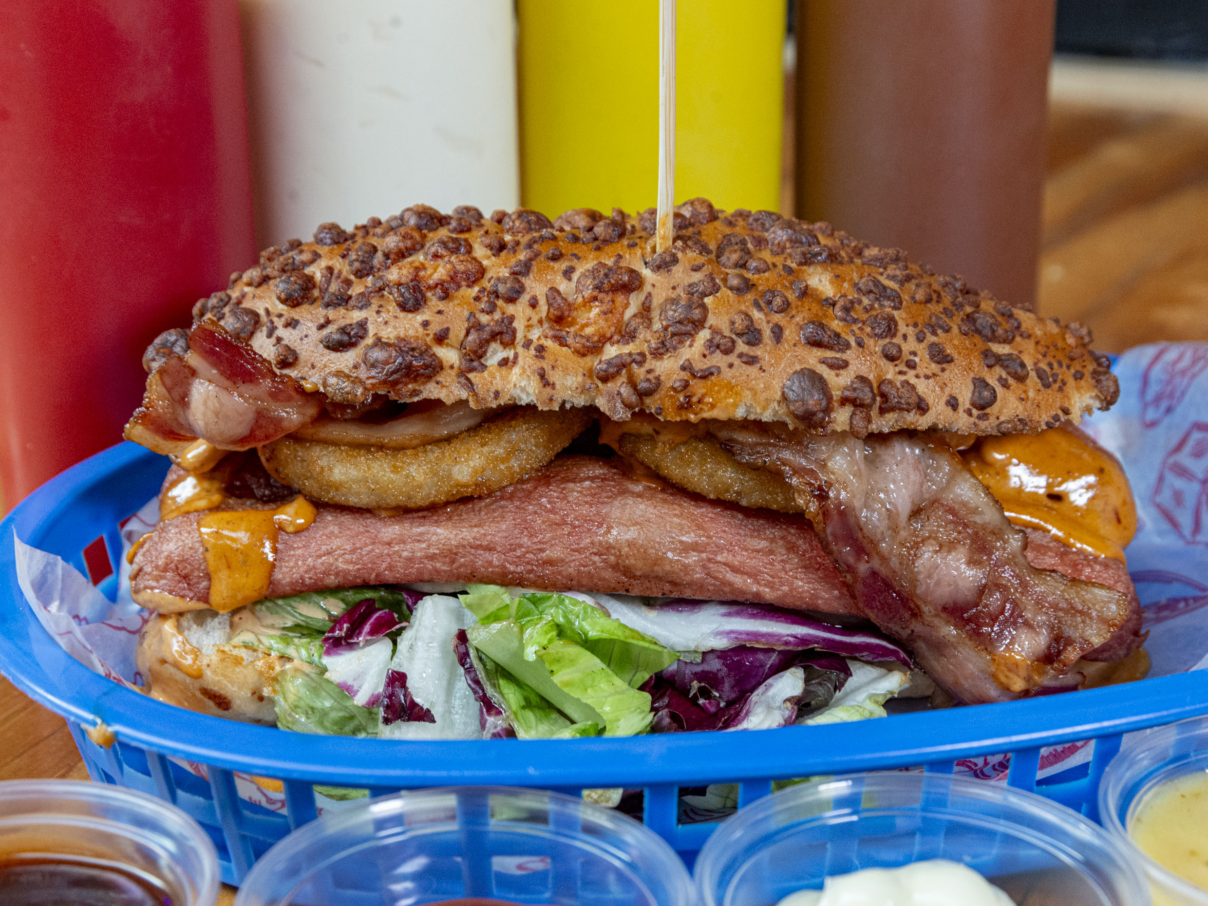 Doble carne gratinada con queso cheddar, mermelada de cebolla, tocino, salsa BBQ, aderezo ranch y coronada con tres aros de cebolla.
