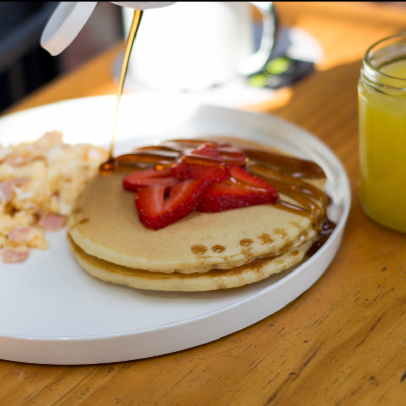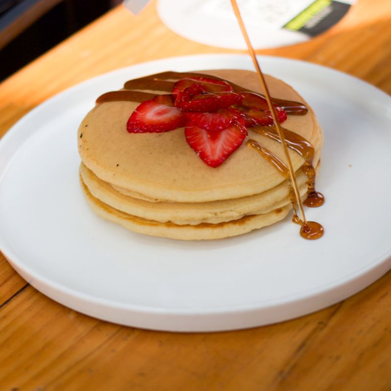 3 Deliciosos hotcakes calientitos, acompañados de miel maple