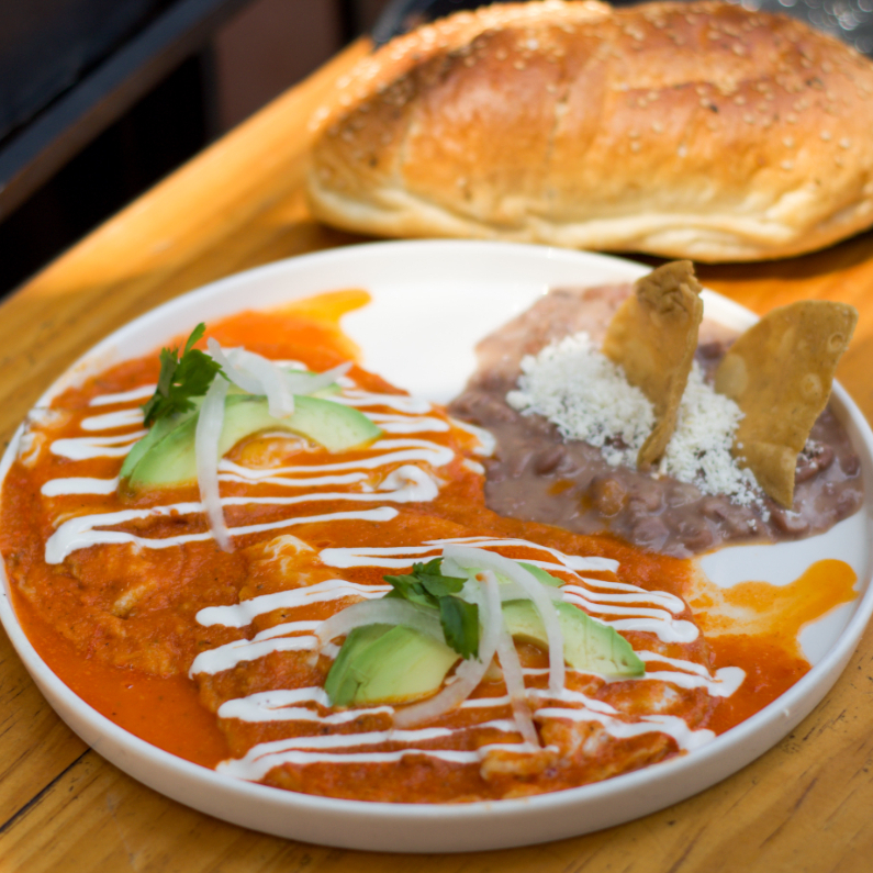 3 deliciosas enchiladas rellenas de pollo con salsa de tu elección, gratinadas con queso, cebolla, crema y acompañadas de una pieza de pan de harina especial.