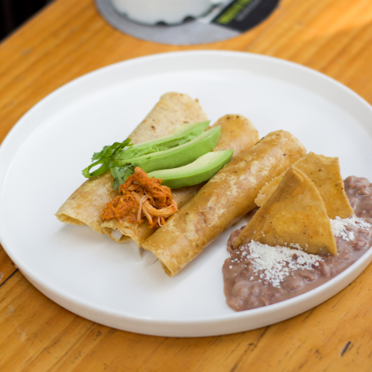 3 deliciosos tacos rellenos de cochinita, acompañados de aguacate, frijoles y chiles habaneros