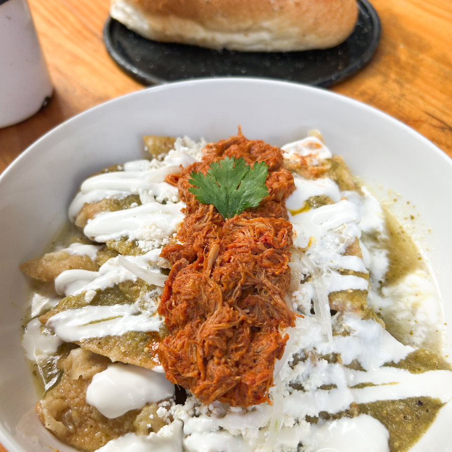 Orden de Chilaquiles, acompañada con 90gr de cochinita, queso, crema, cebolla, incluye una pieza de pan de harina especial.