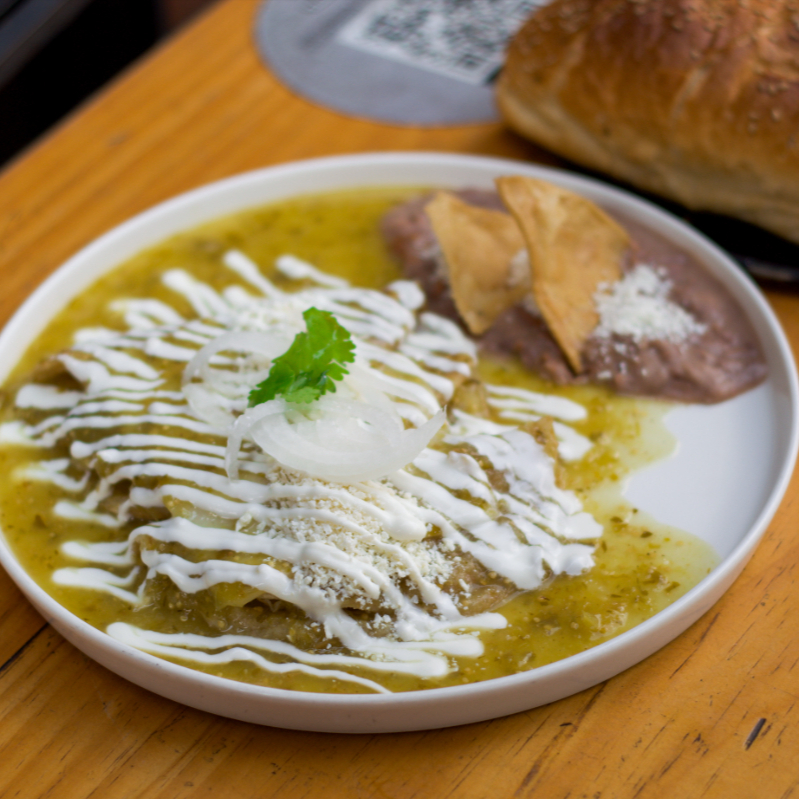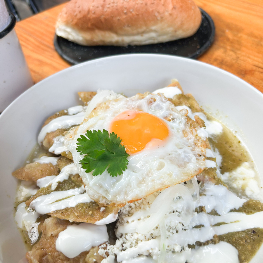 Orden de Chilaquiles, acompañada con 1 pieza de huevo, queso, crema, cebolla, incluye una pieza de pan de harina especial.