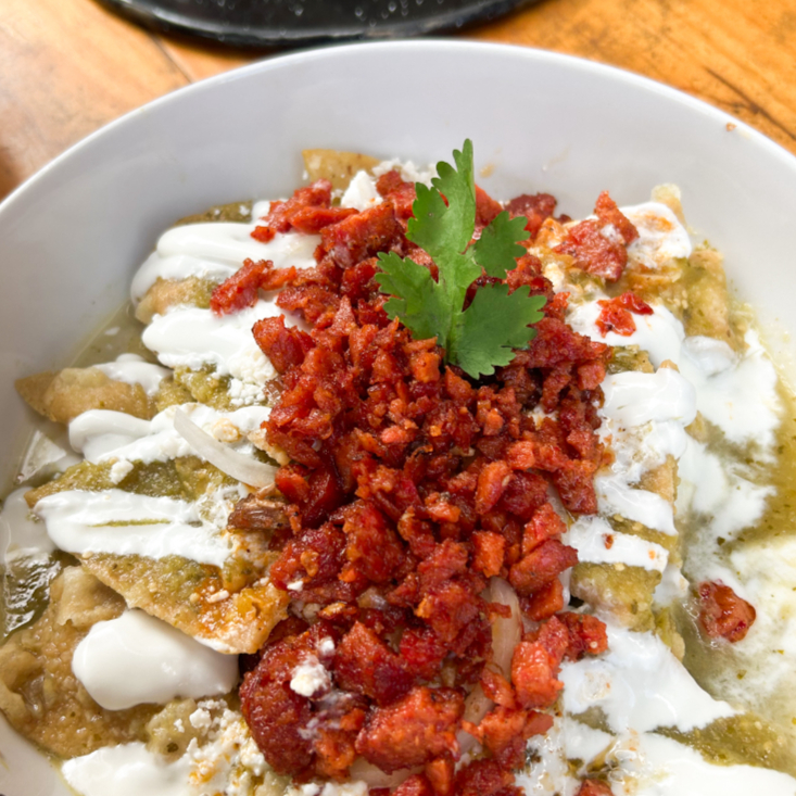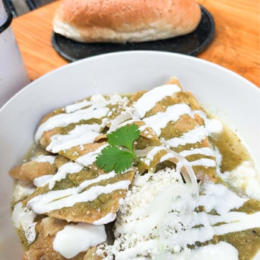 Orden de Chilaquiles, acompañada con 90gr de chorizo, queso, crema, cebolla, incluye una pieza de pan de harina especial.