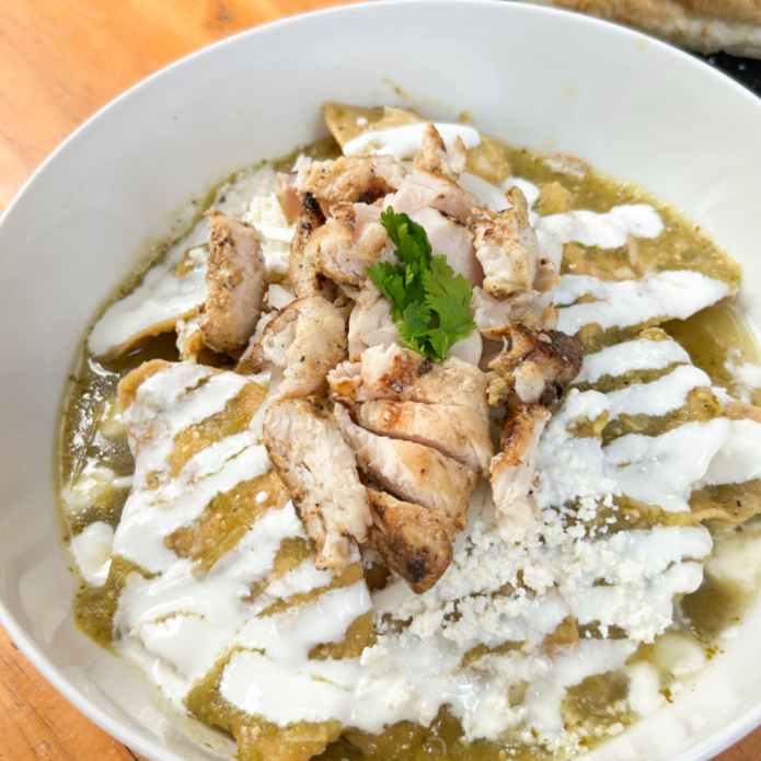 Orden de Chilaquiles, acompañada con 90gr de pollo, queso, crema, cebolla, incluye una pieza de pan de harina especial.