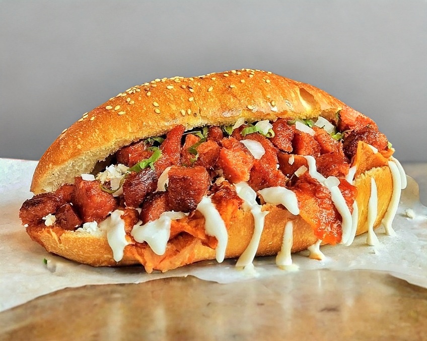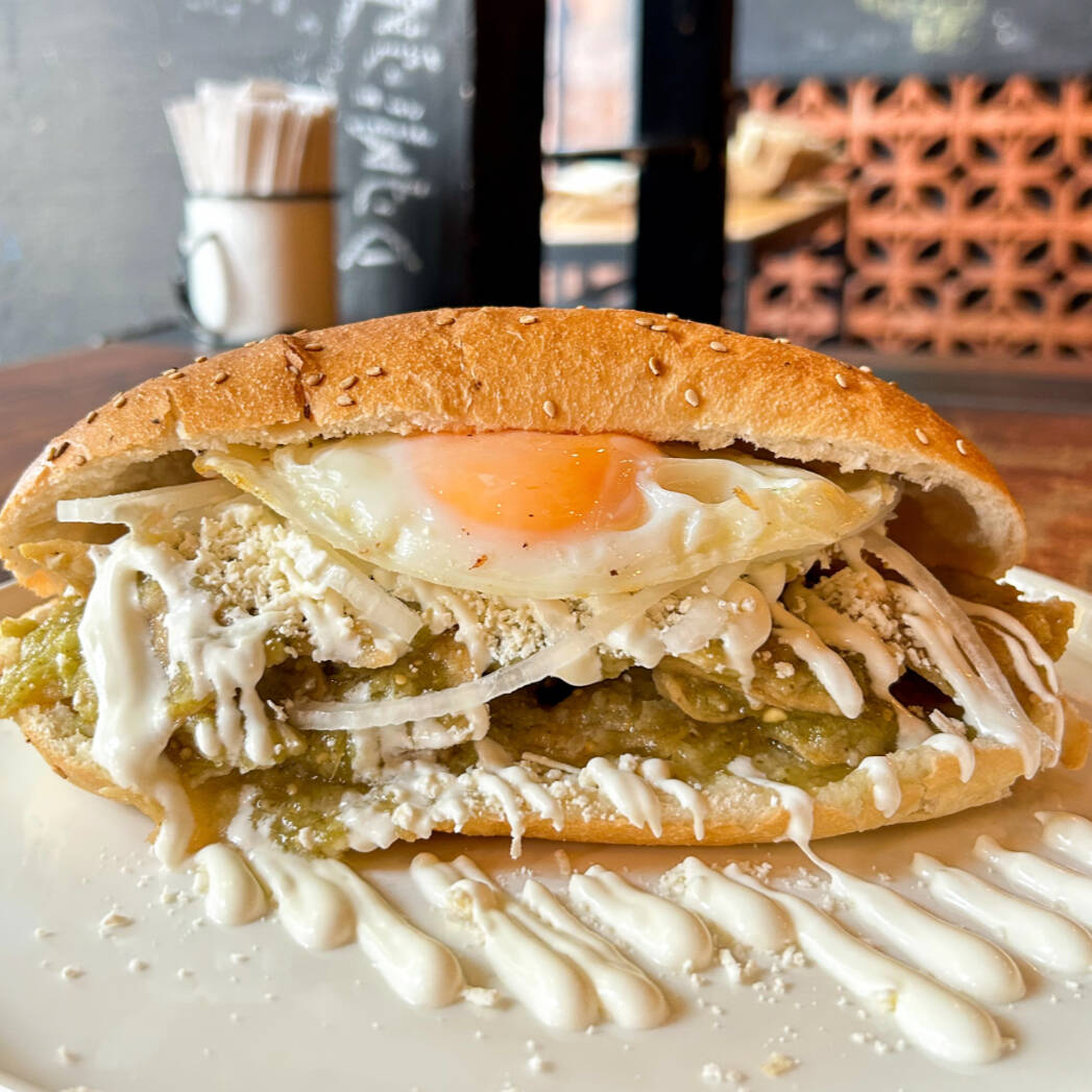 Torta de chilaquiles acompañada con 90 gr de cochinita, queso, crema, cebolla, incluye su pan de harina especial del doble tamaño de un bolillo normal