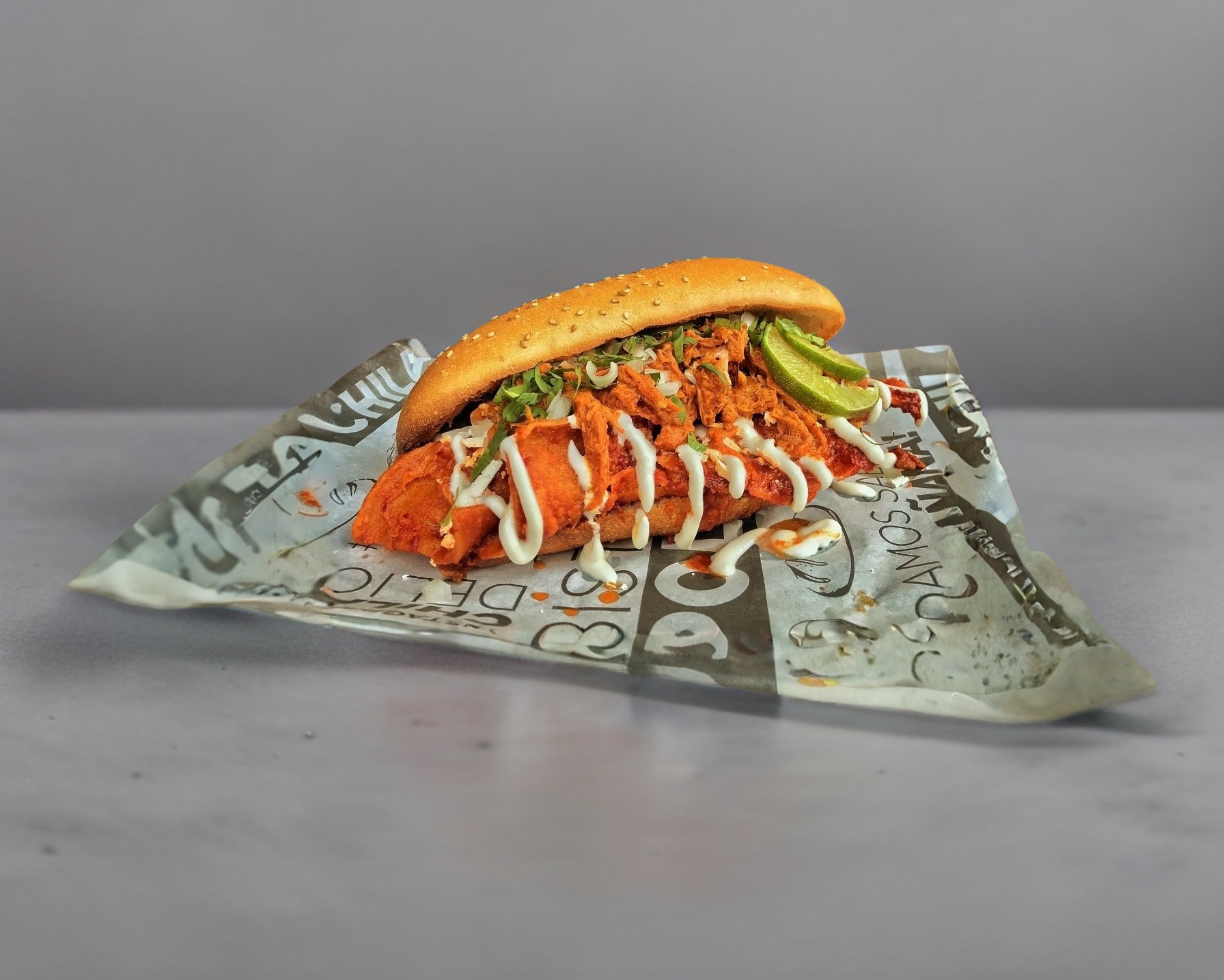 Torta de chilaquiles acompañada con 90 gr de pollo, queso, crema, cebolla, incluye su pan de harina especial del doble tamaño de un bolillo normal