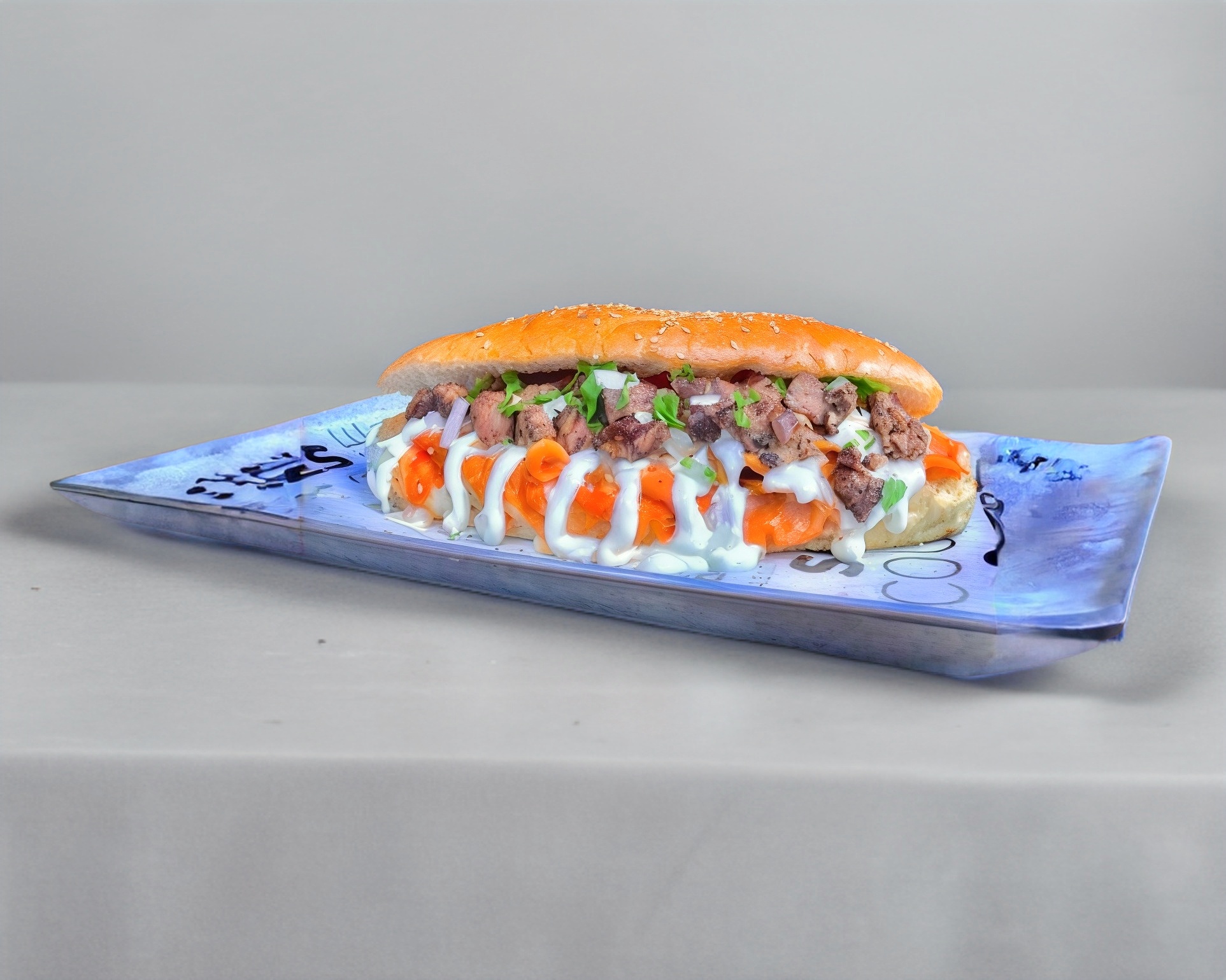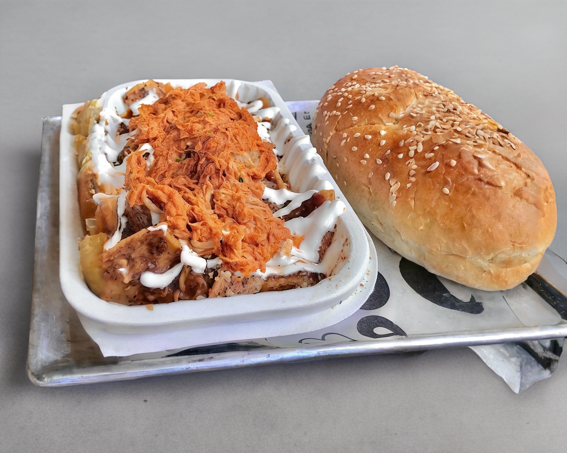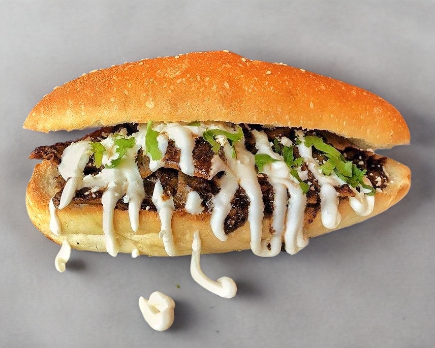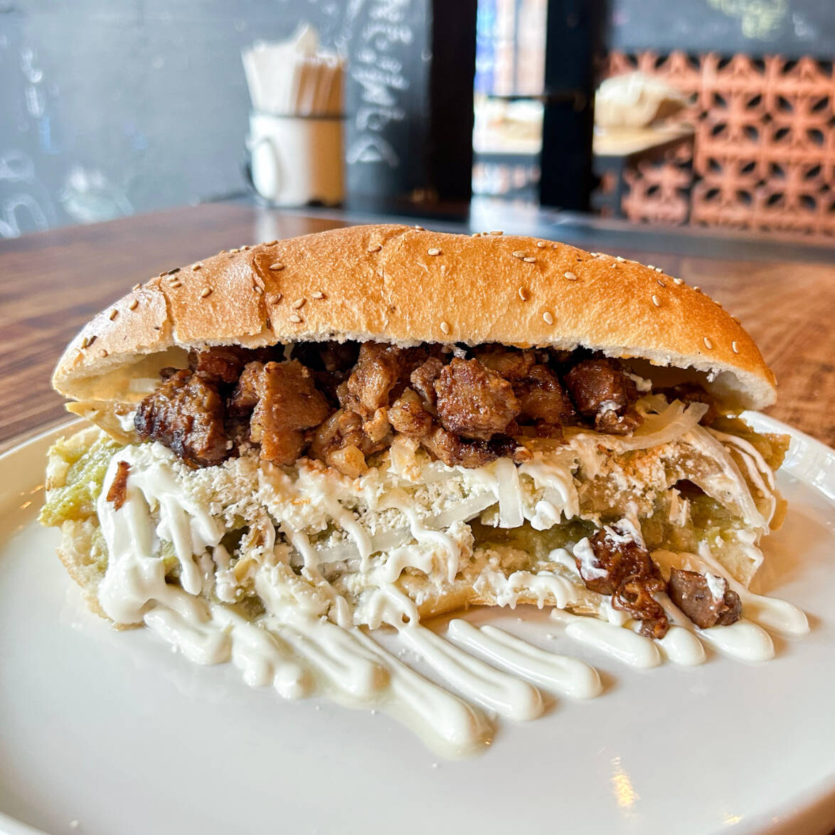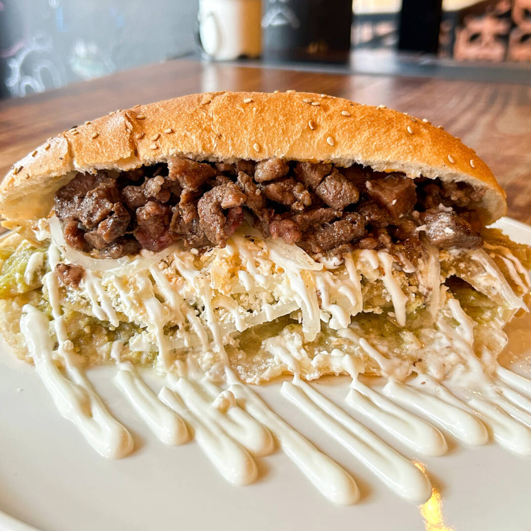 Torta de chilaquiles acompañada con 90 gr de bistec, queso, crema, cebolla, incluye su pan de harina especial del doble tamaño de un bolillo normal