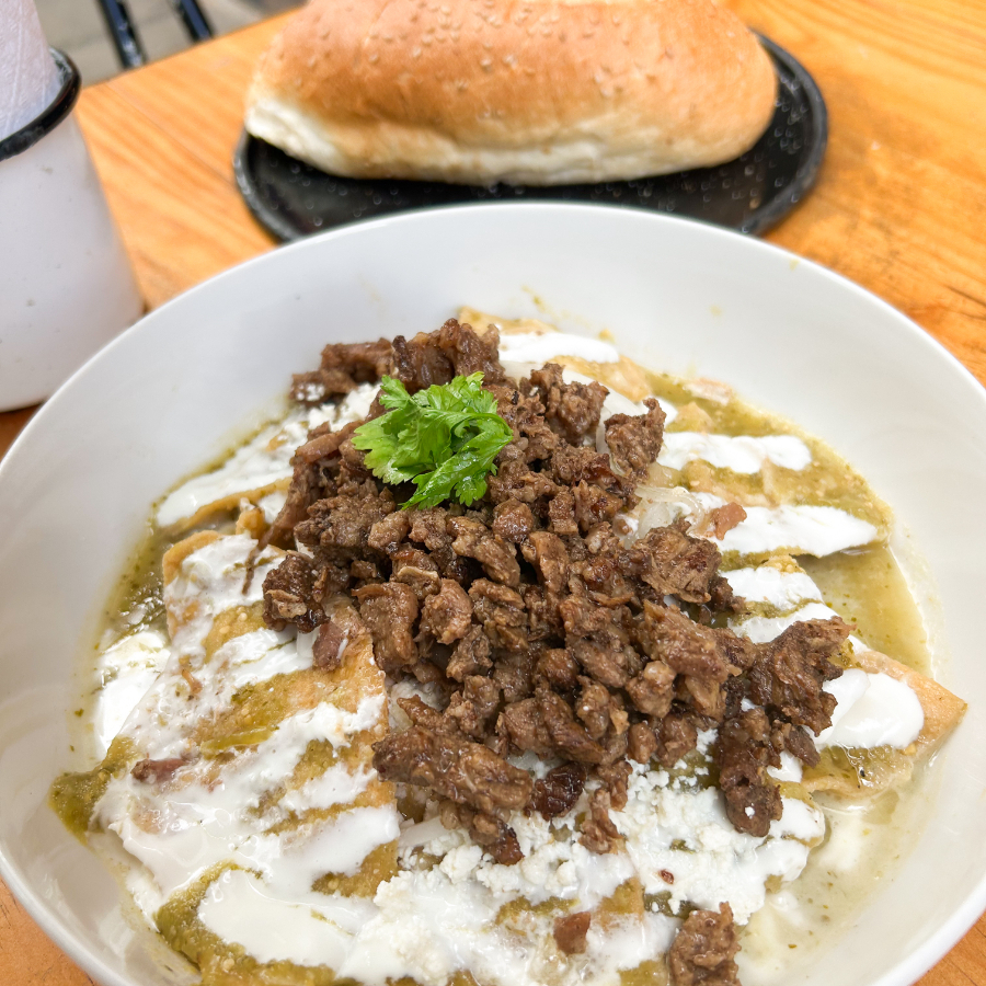 Orden de chilaquiles, acompañados con 90gr de suadero, queso, crema, cebolla, incluye una pieza de pan de harina especial