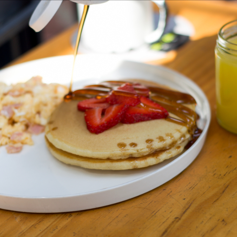 3 deliciosos hotcakes calientitos acompañados de miel maple