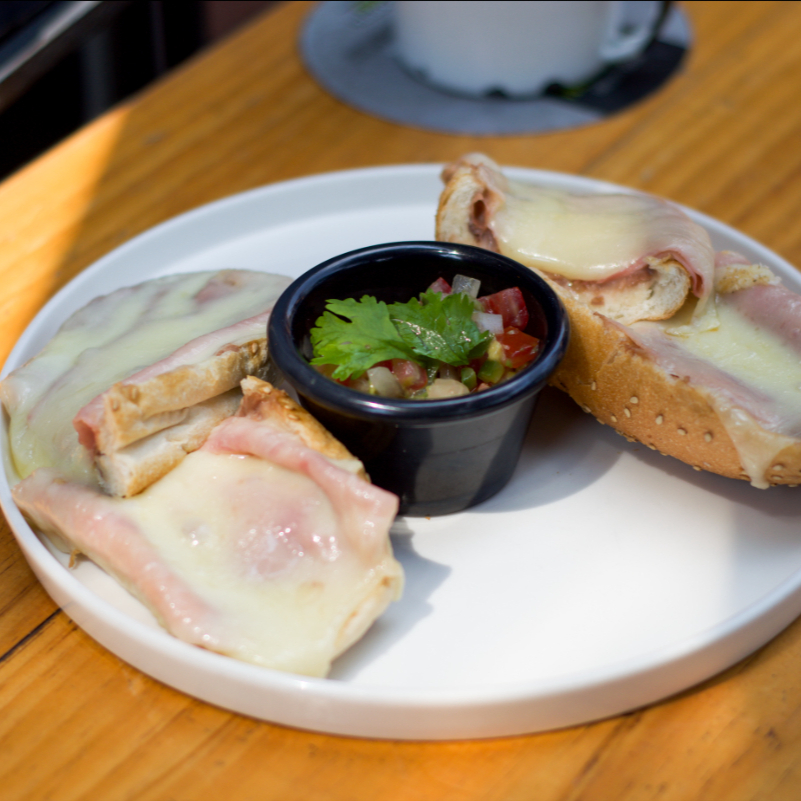 Deliciosos molletes con frijoles, jamón y queso gratinado acompañados de pico de gallo