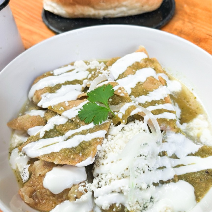 Orden de chilaquiles acompañados con queso, crema, cebolla, incluye una pieza de pan de harina especial
