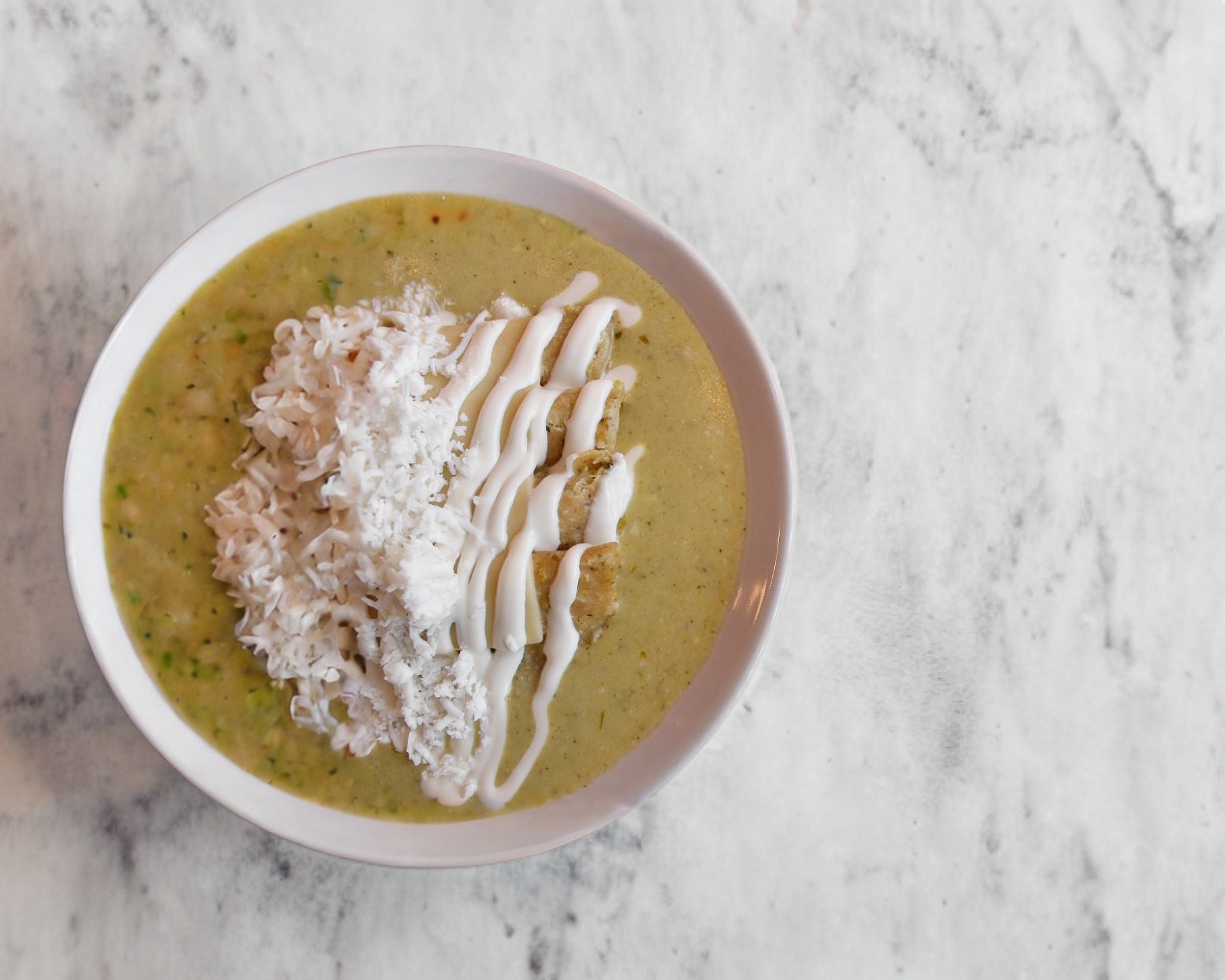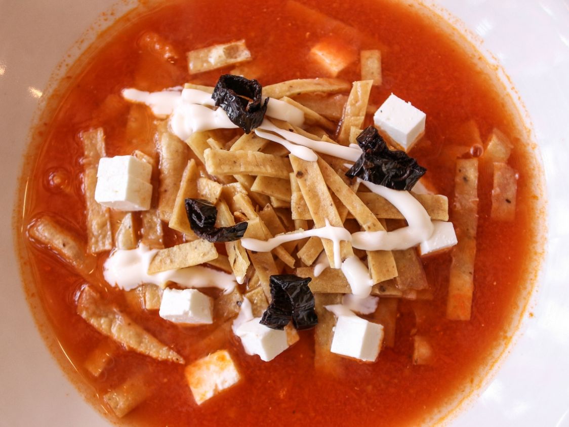 Caldillo de jitomate, montado con tortilla frita, Chile pasilla crema ácida y queso panela.