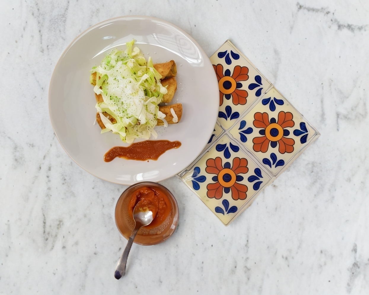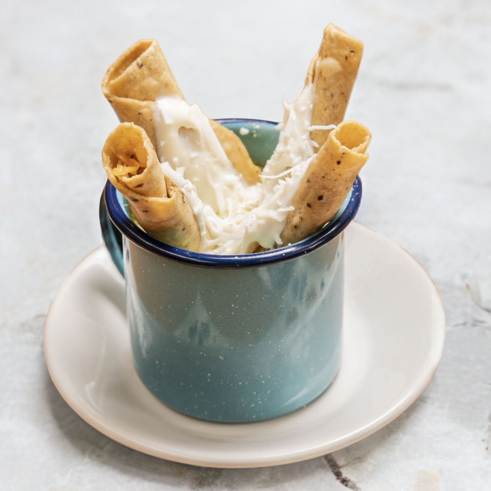 Doraditos, untados con frijoles refritos, pollo deshebrado, queso gratinado, lechuga, crema y queso.