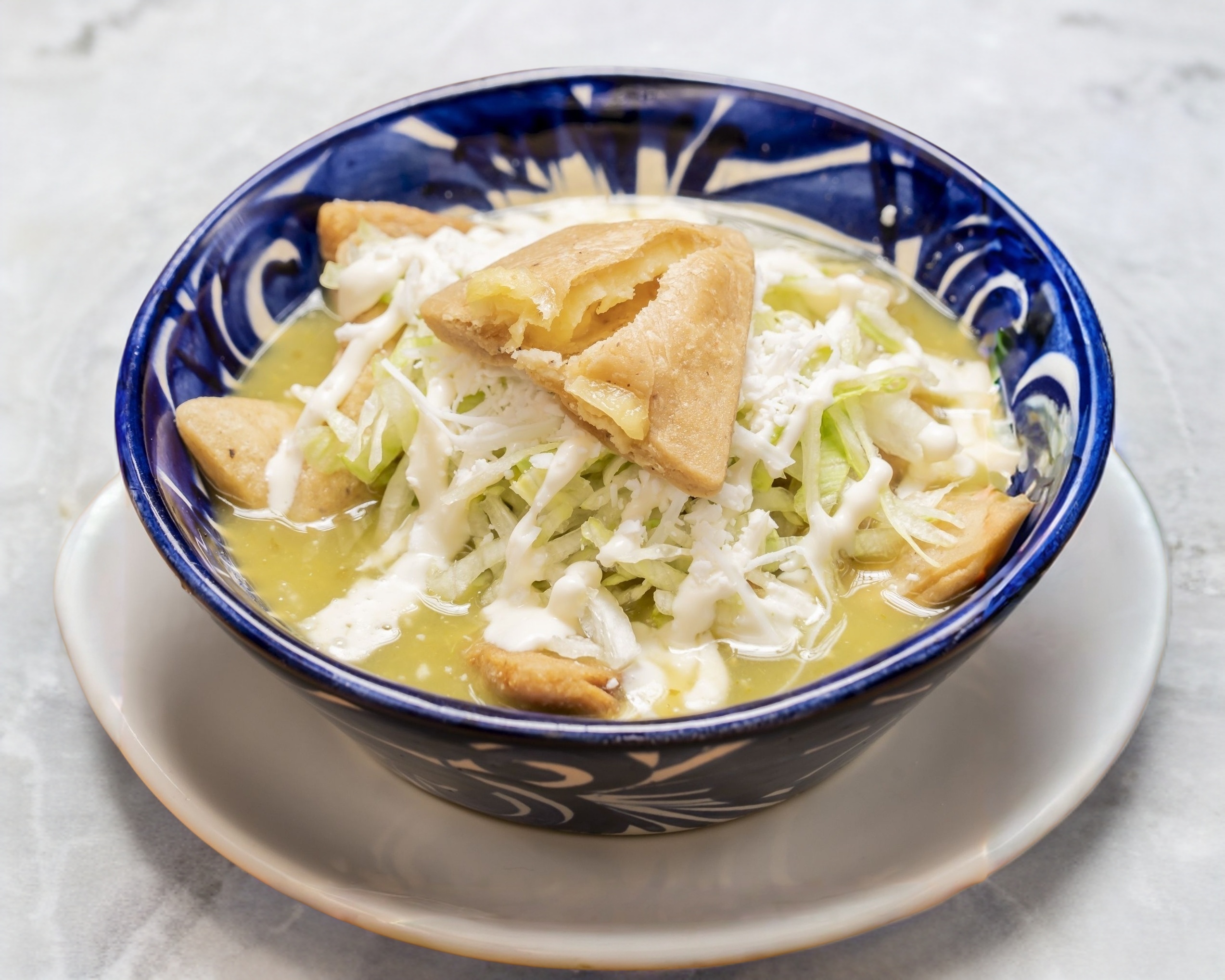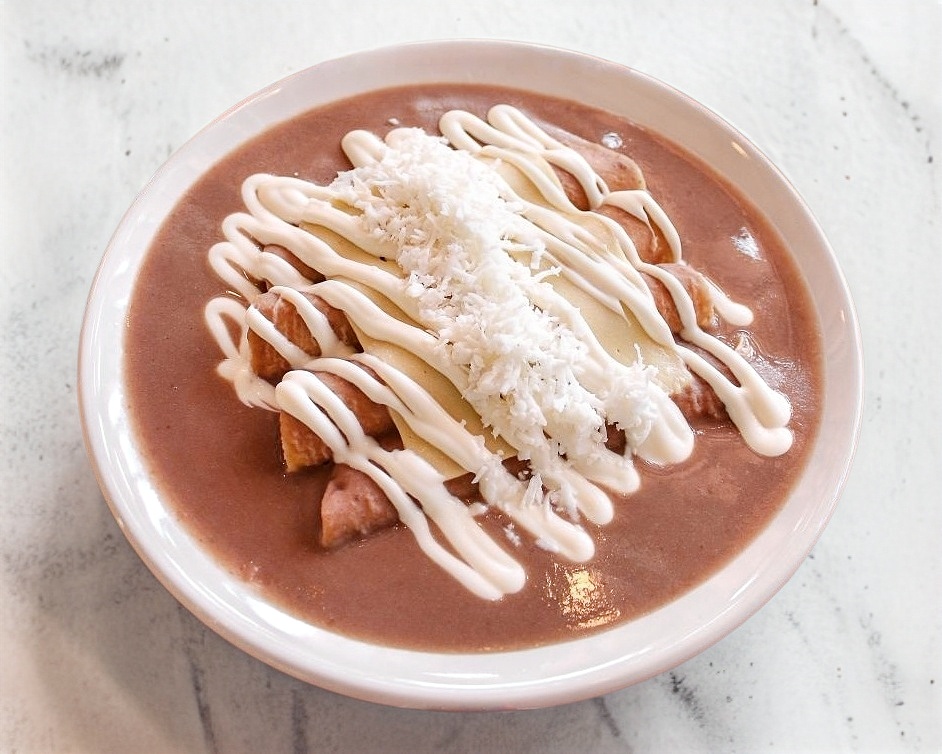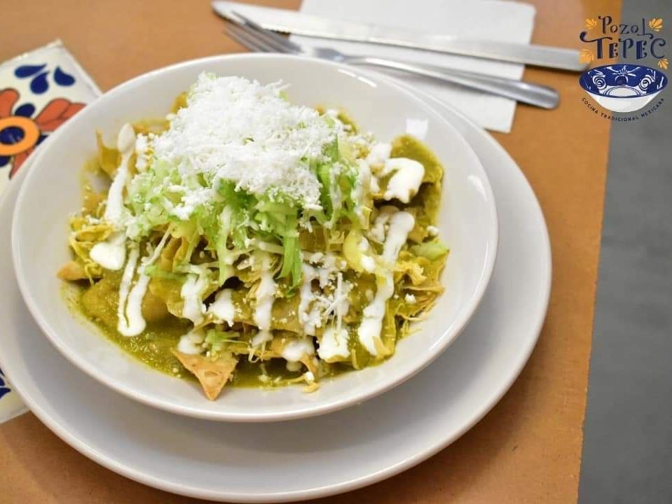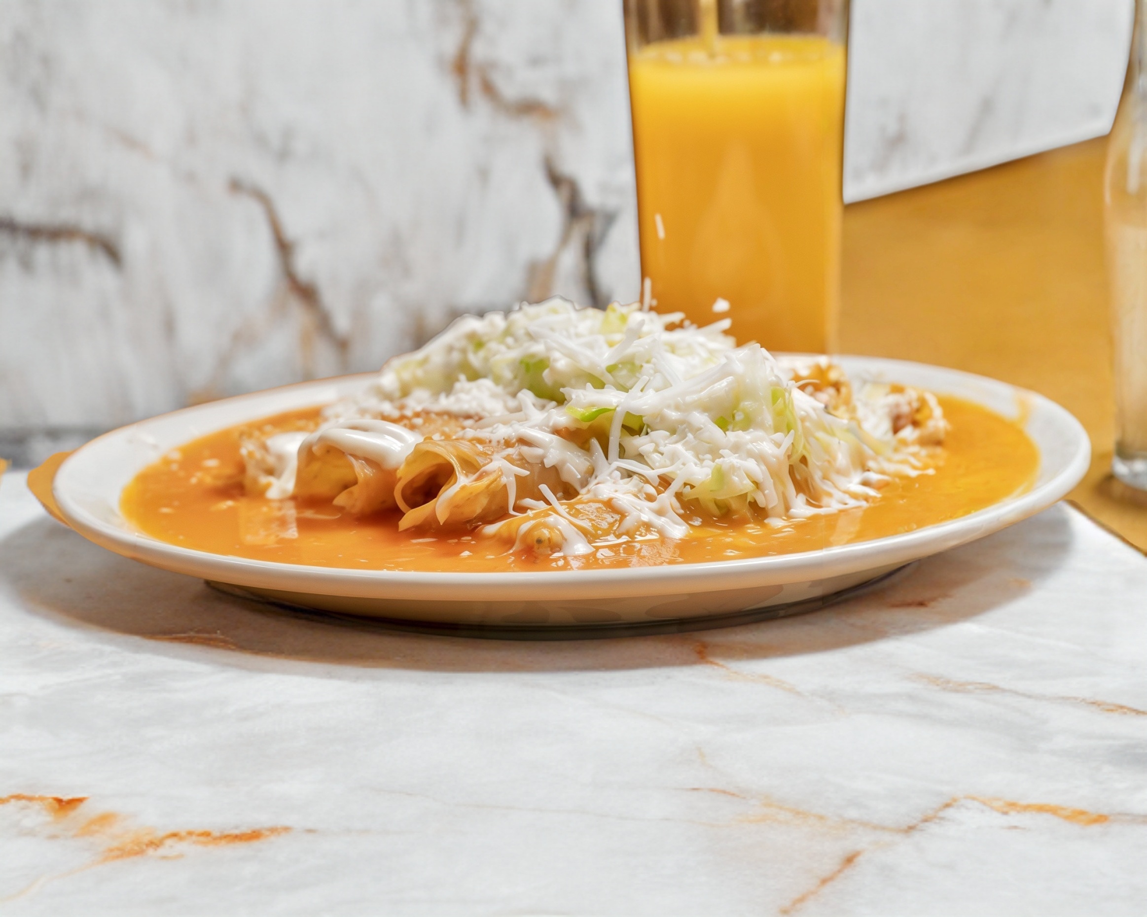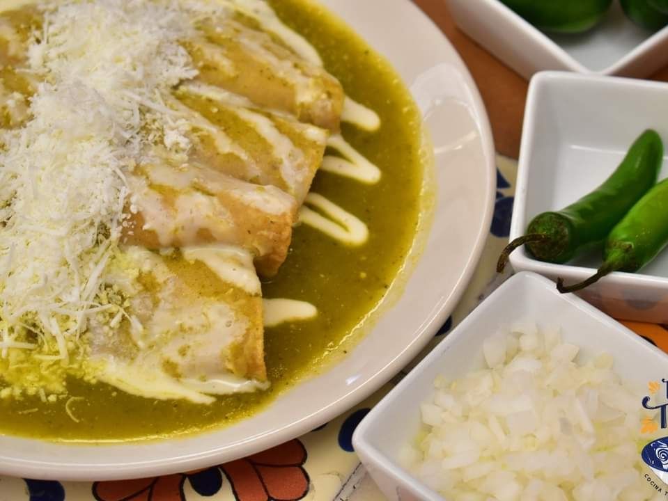 Las tradicionales, rellenas de pollo bañadas en caldillo de frijol gratinadas con queso manchego y acompañadas con queso rallado y crema.