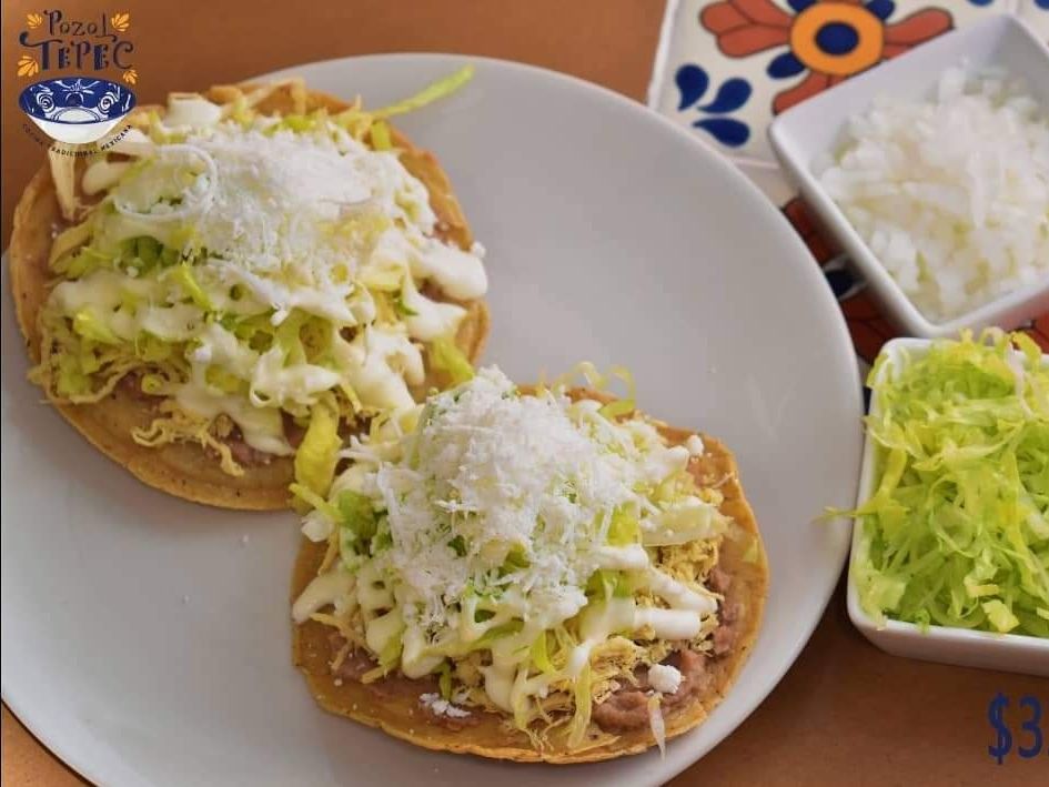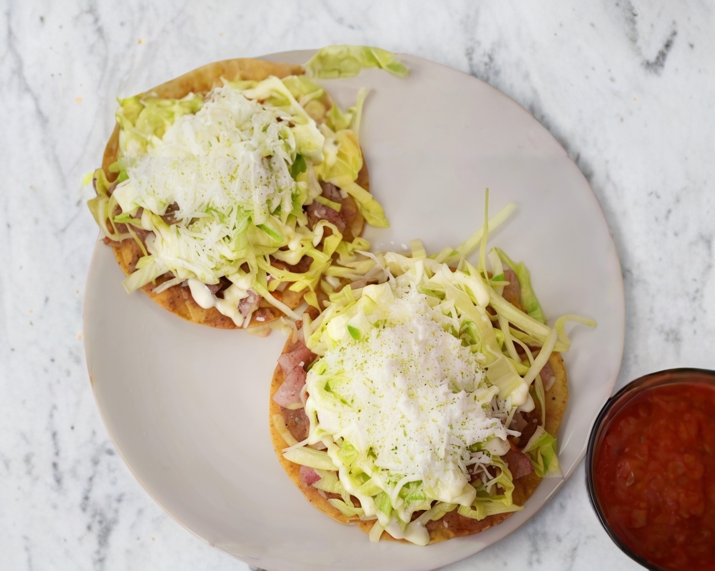 Topos de maiz hechos a mano rellenos de Carne Molida. Servidos con lechuga, crema y queso rallado.