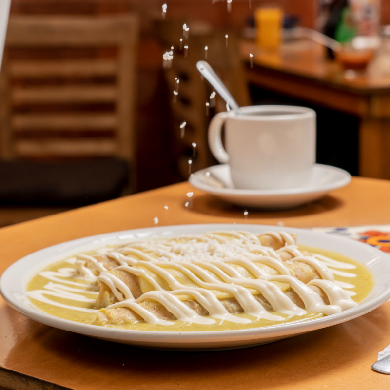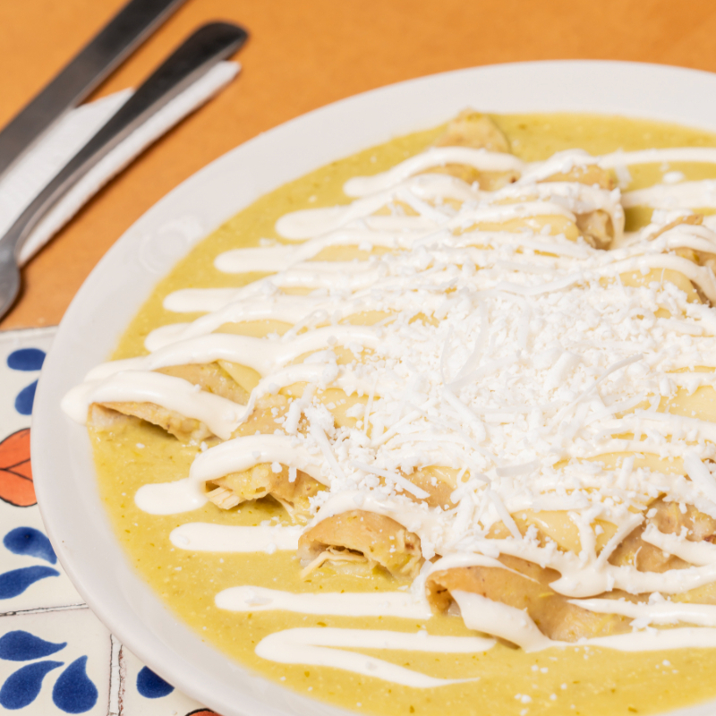 Tortillas rellenas de pollo bañadas en salsa cremosa verde, gratinadas con queso. Suaves y llenas de sabor, una opción deliciosa de la cocina mexicana.